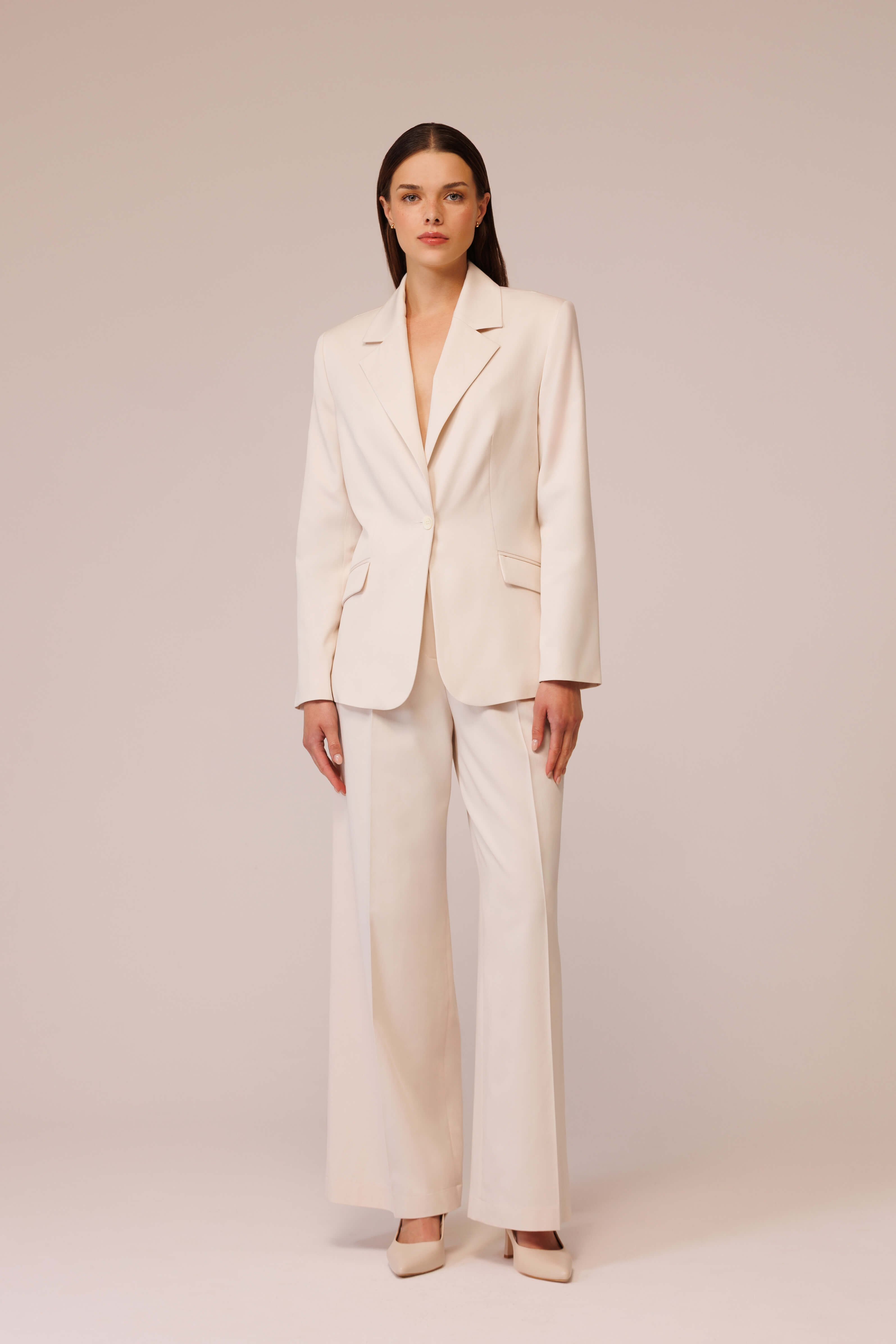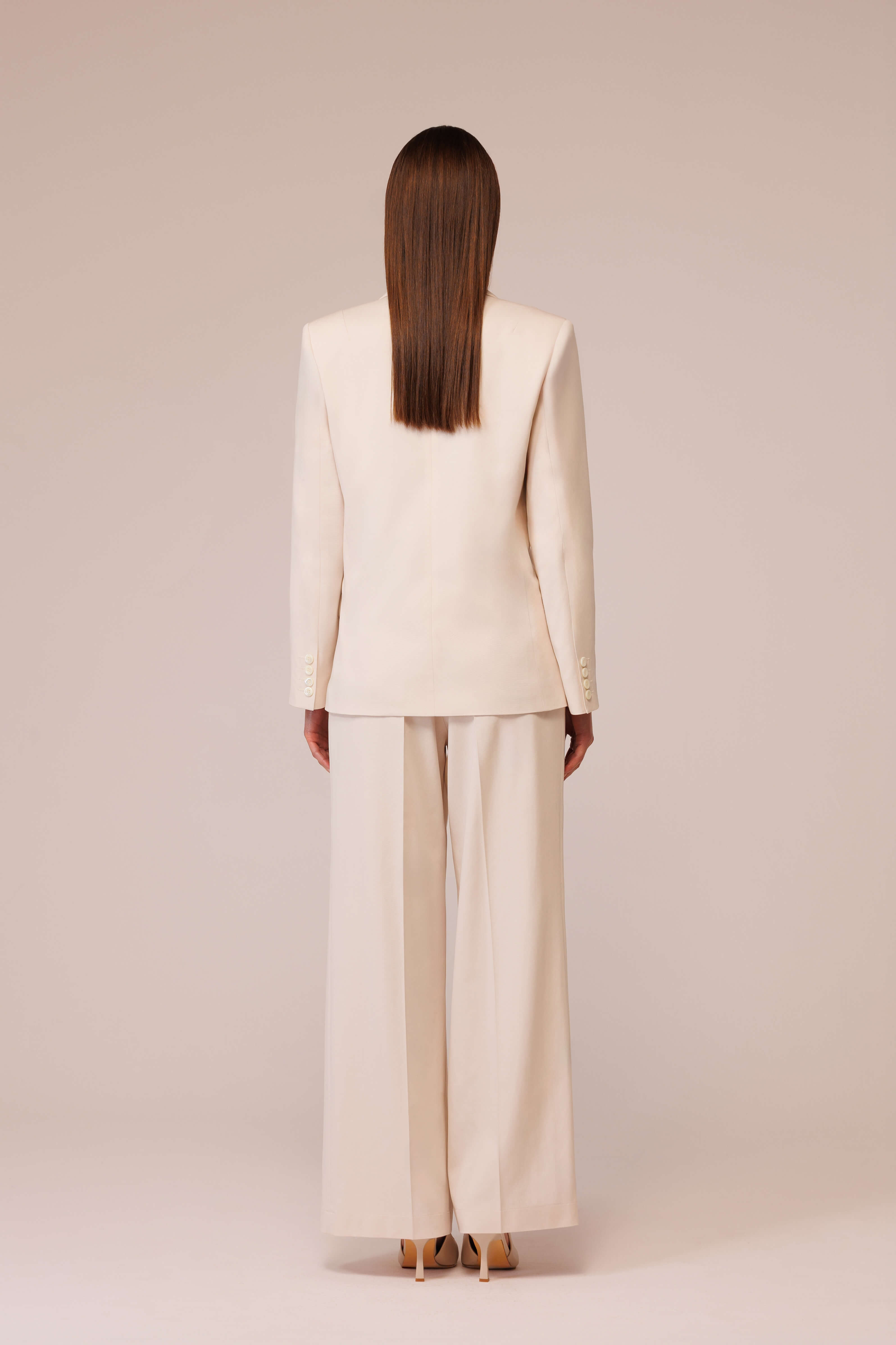 يتم إغلاق واجهة الهيكل بواسطة زر ضخم مصنوع من اللؤلؤ الطبيعي، تم اختياره بعناية خصيصًا لهذا المشروع، حيث يكمل لونه العميق وحجمه النبيل التركيبة دون الحاجة إلى تباين مفرط، في حين تم الانتهاء من كل من الأكمام بأربعة أزرار متطابقة مصنوعة من نفس اللؤلؤ، مما يؤكد على تماسك ودقة التفاصيل. هناك أيضًا جيبان بغطاء في الأمام.