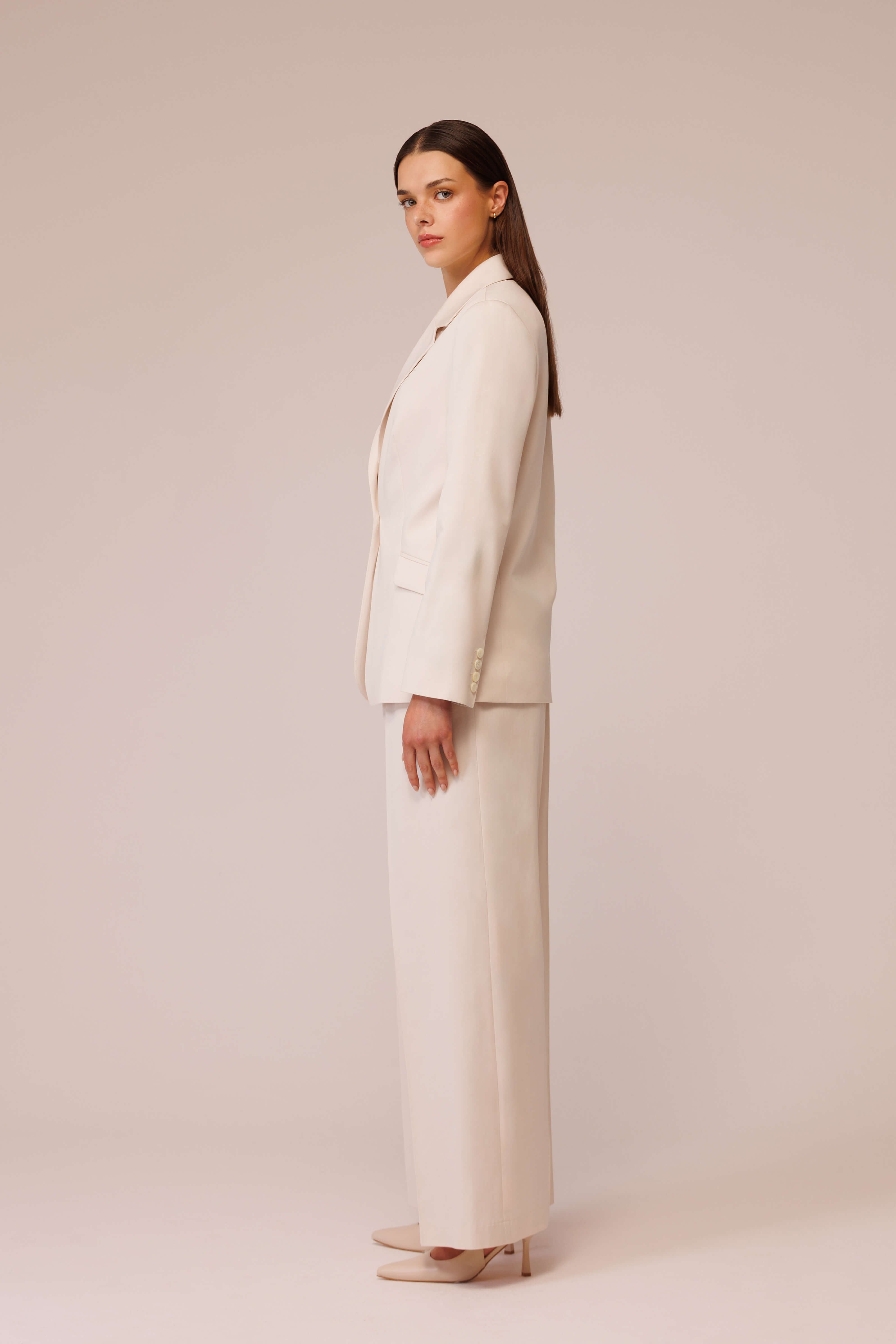 تم تصميم السترة ذات الخصر الناعم مع إحساس بالتناسب والسعي الواعي إلى شكل واضح، وهي مخيطة من مزيج عالي الجودة من ألياف Tencel™ والقطن، مما يوفر بنية ملحوظة وراحة في الارتداء.