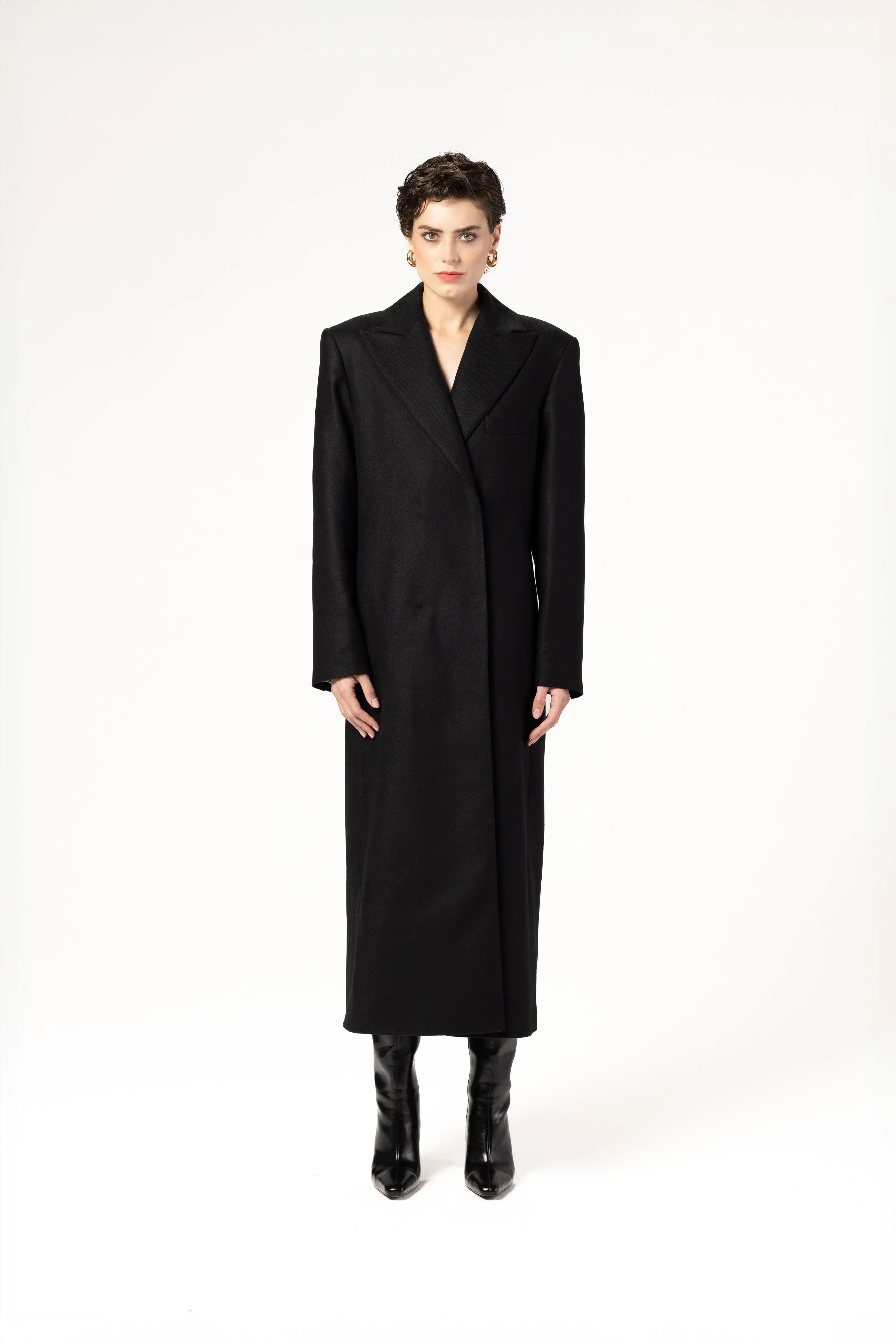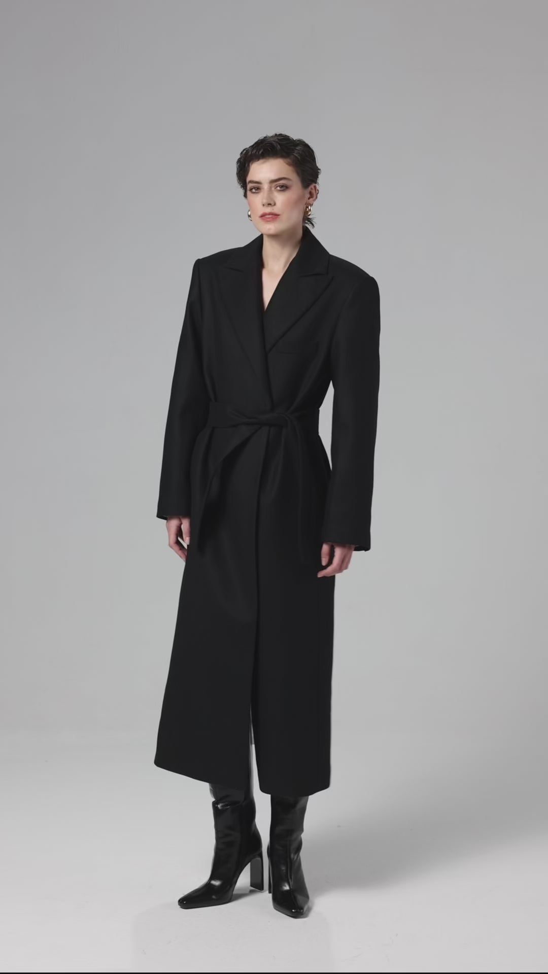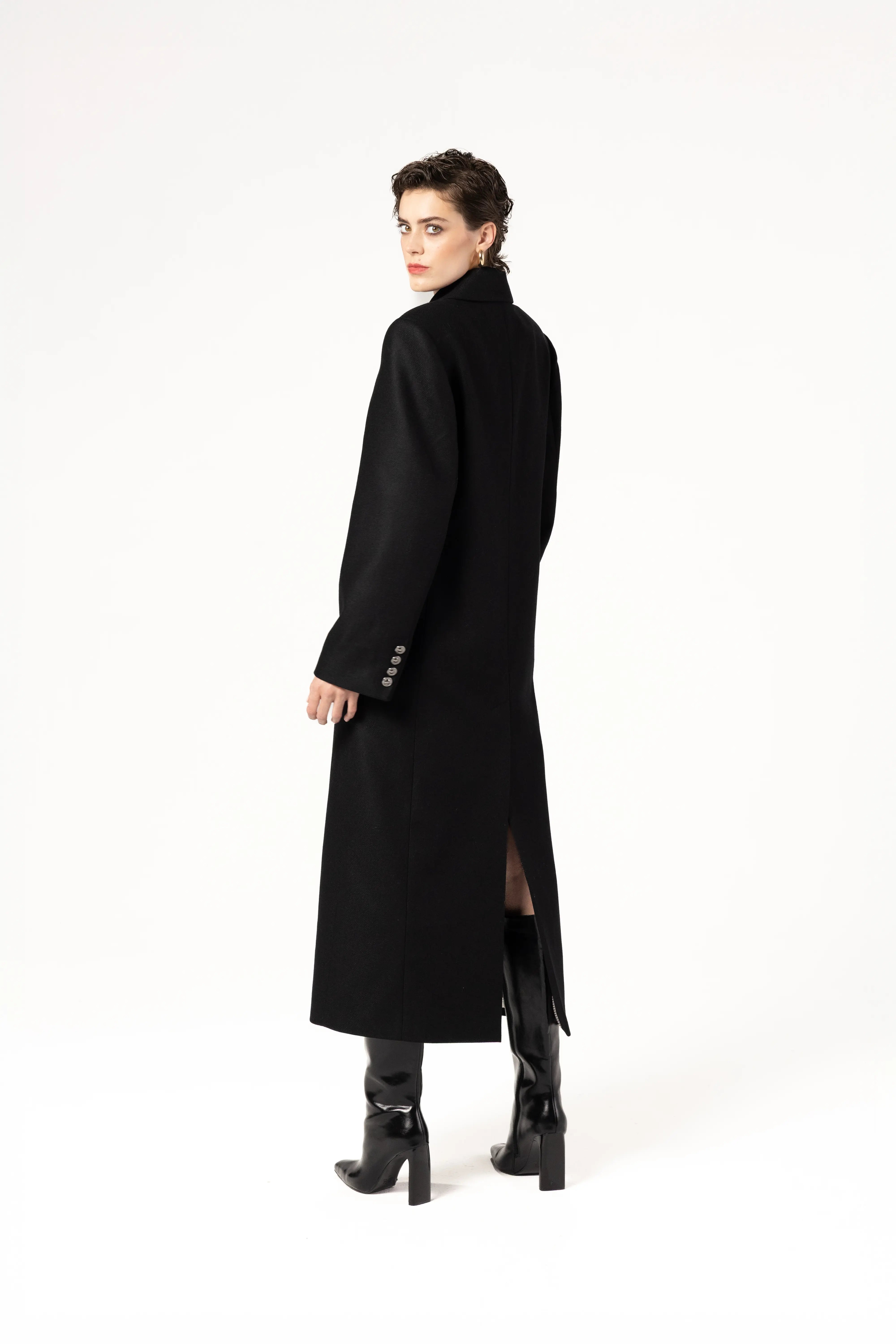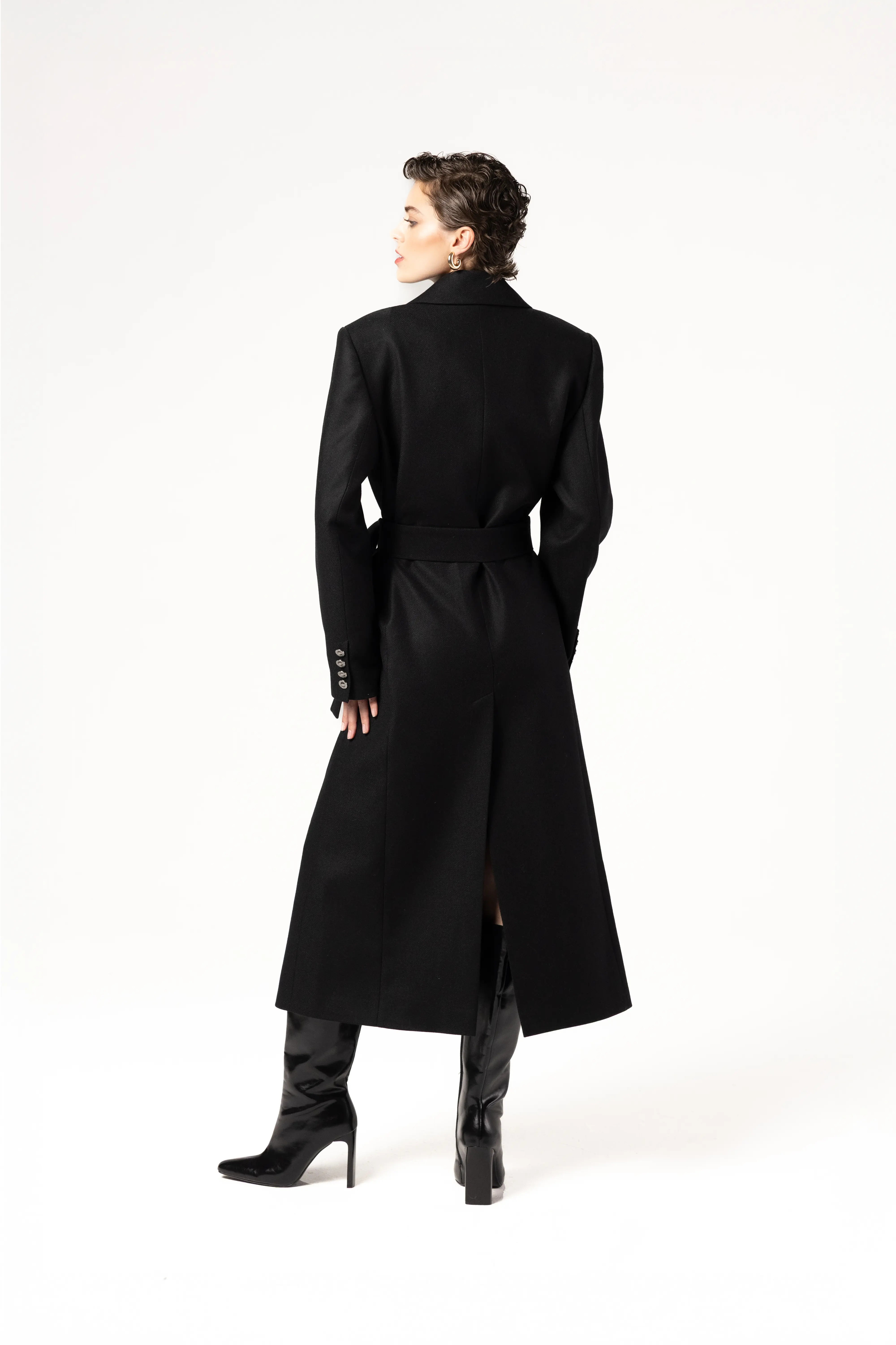 A delicately fitted maxi coat, designed with a balanced construction and calm silhouette proportions. This double-breasted coat fastens with four magnetic clasps, and is complemented by an additional oxidized hook and loop fastening and a belt to tie at the waist.