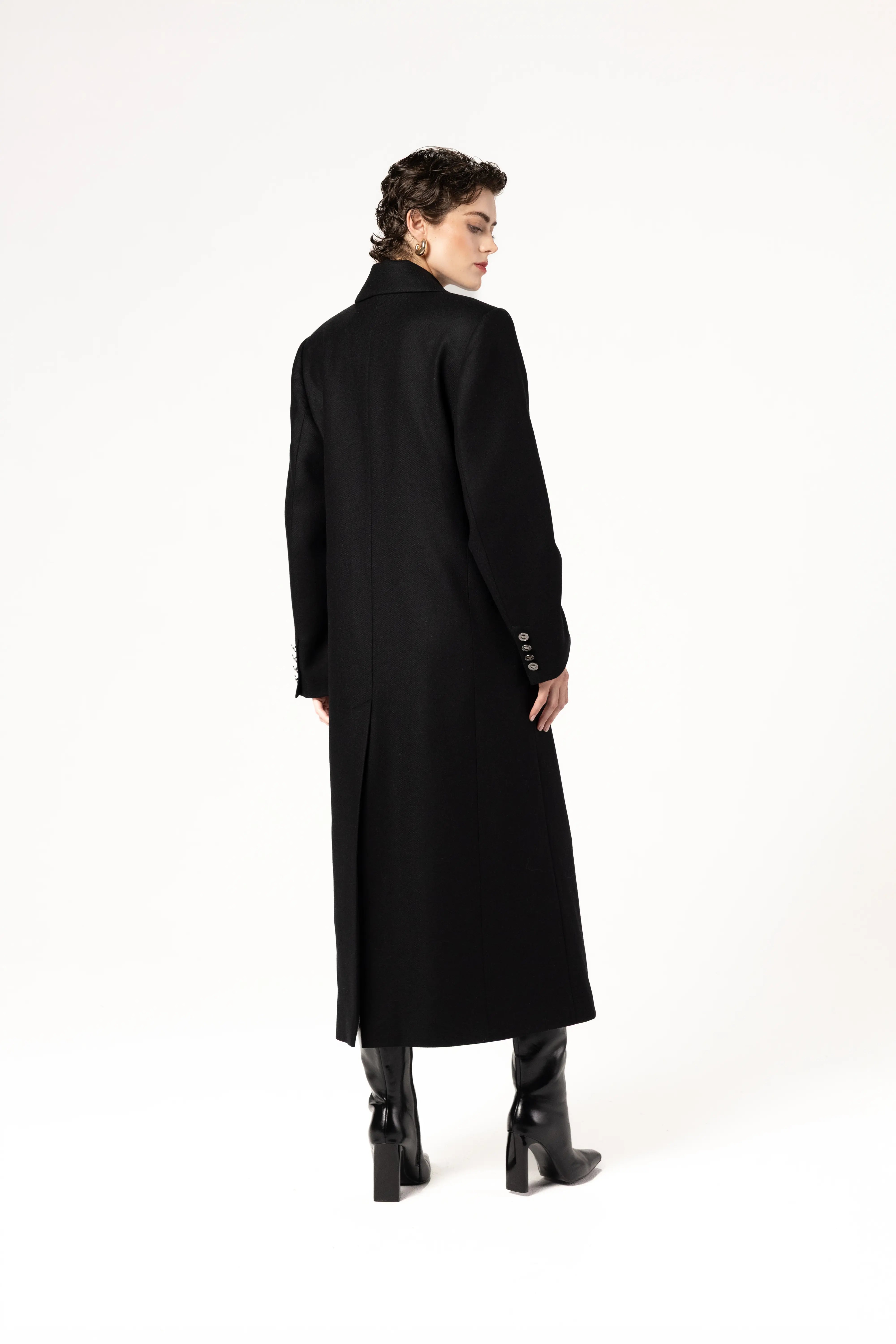 The design features broadened shoulders and a slightly lowered armhole, with a high rear vent that allows for ease of movement and elongates the back. Wide lapels enhance the coat's character, and four burnished metal buttons on the cuffs provide a subtle design accent.