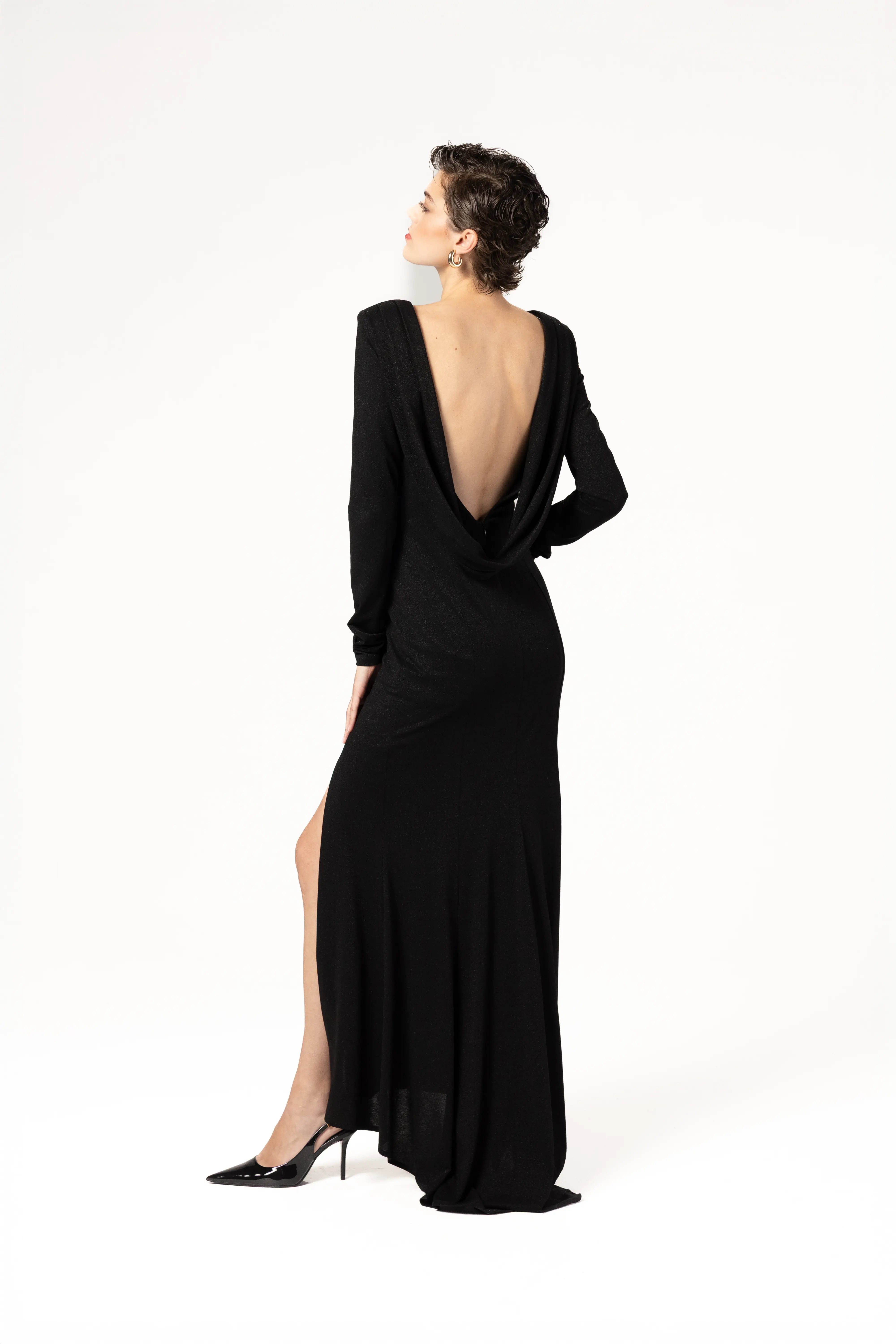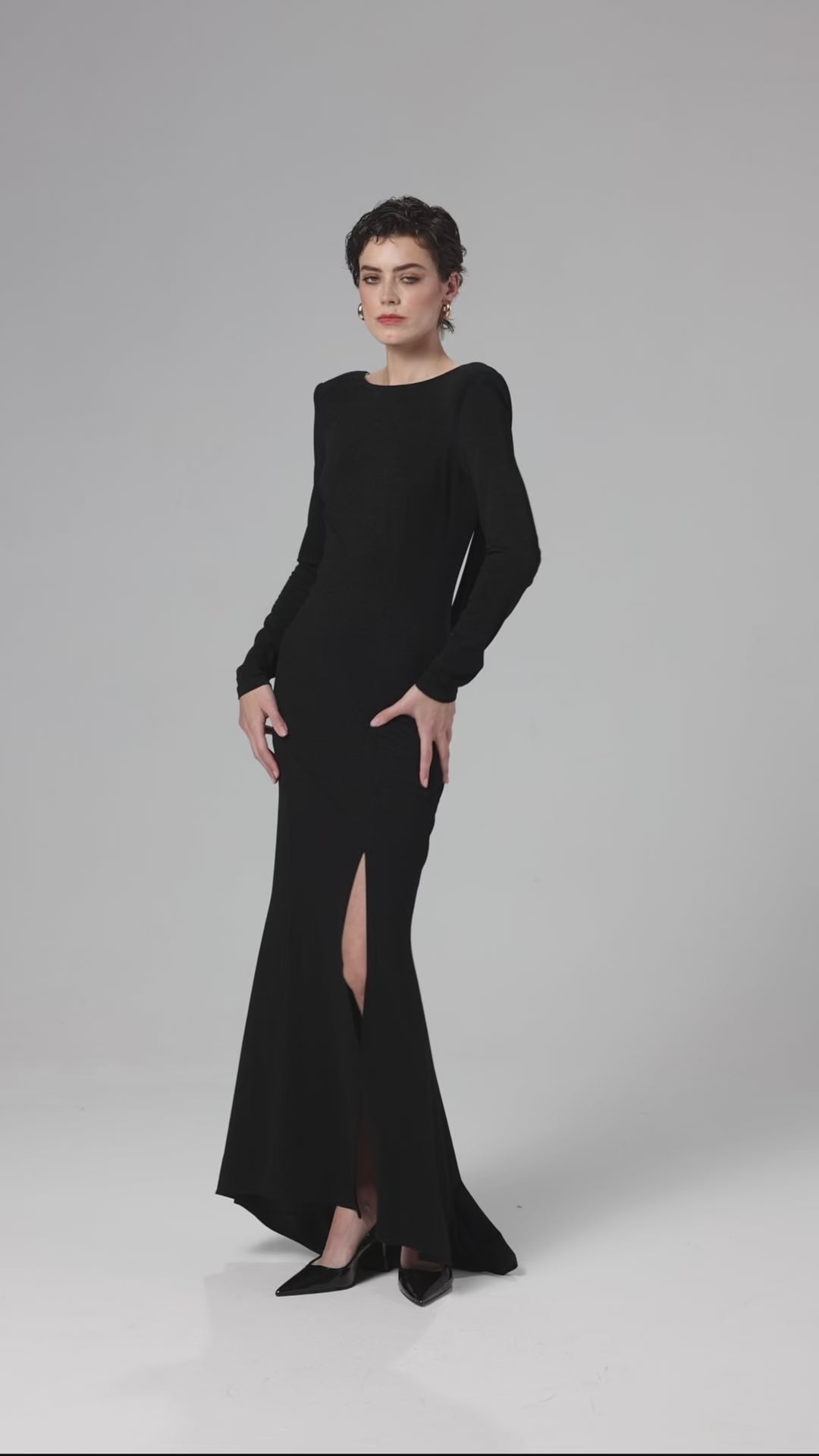 This maxi dress is designed to create a clean, elongated silhouette. The front remains closed, with a smooth surface and clearly defined shoulders, creating a strong, structured rhythm. The sleeves are elongated, emphasizing the verticality and enhancing the impression of lightness.