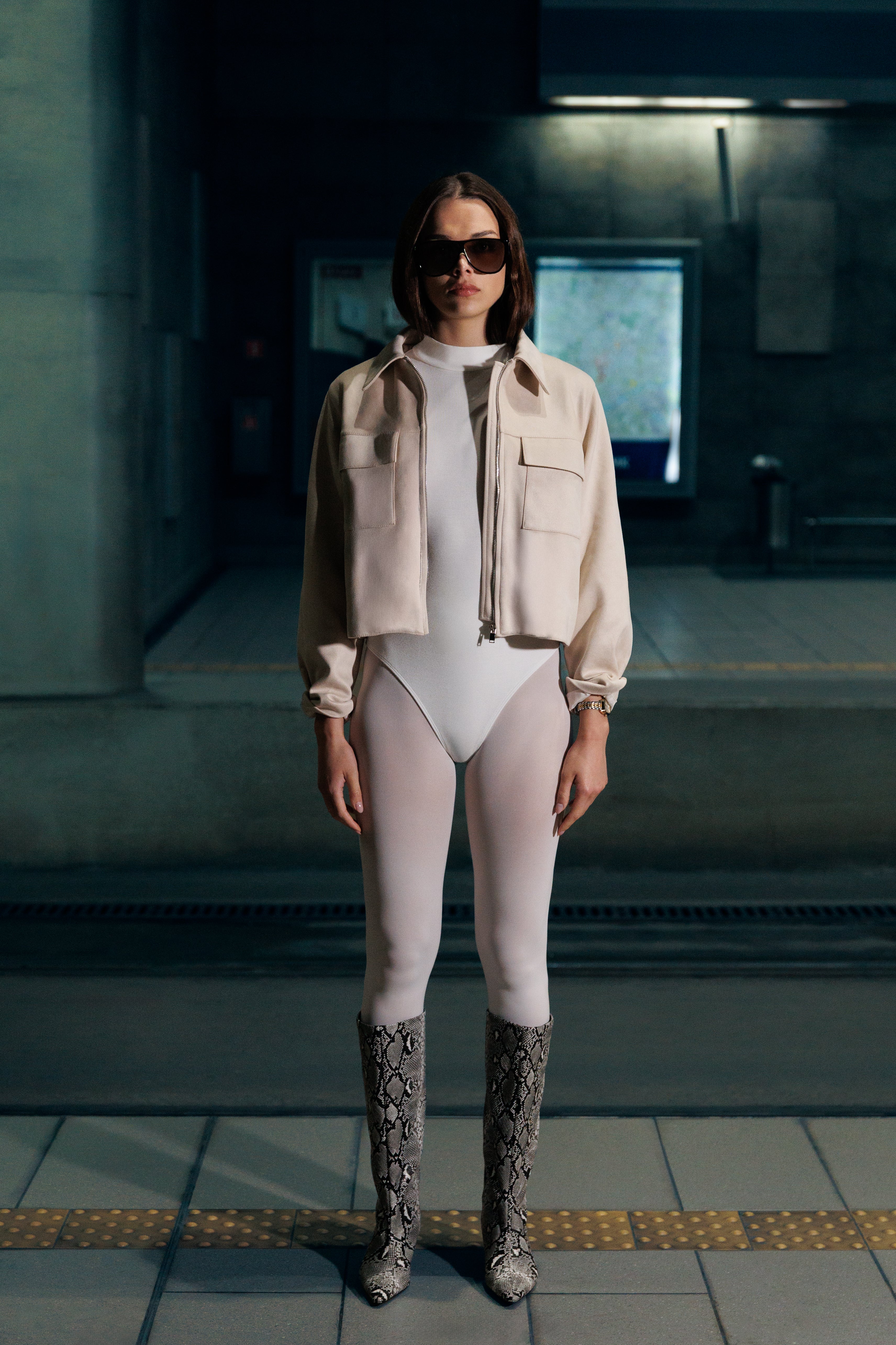 El corte es ligeramente corto, llegando hasta la cintura, ajustado en proporciones a la silueta, con un carácter moderno.