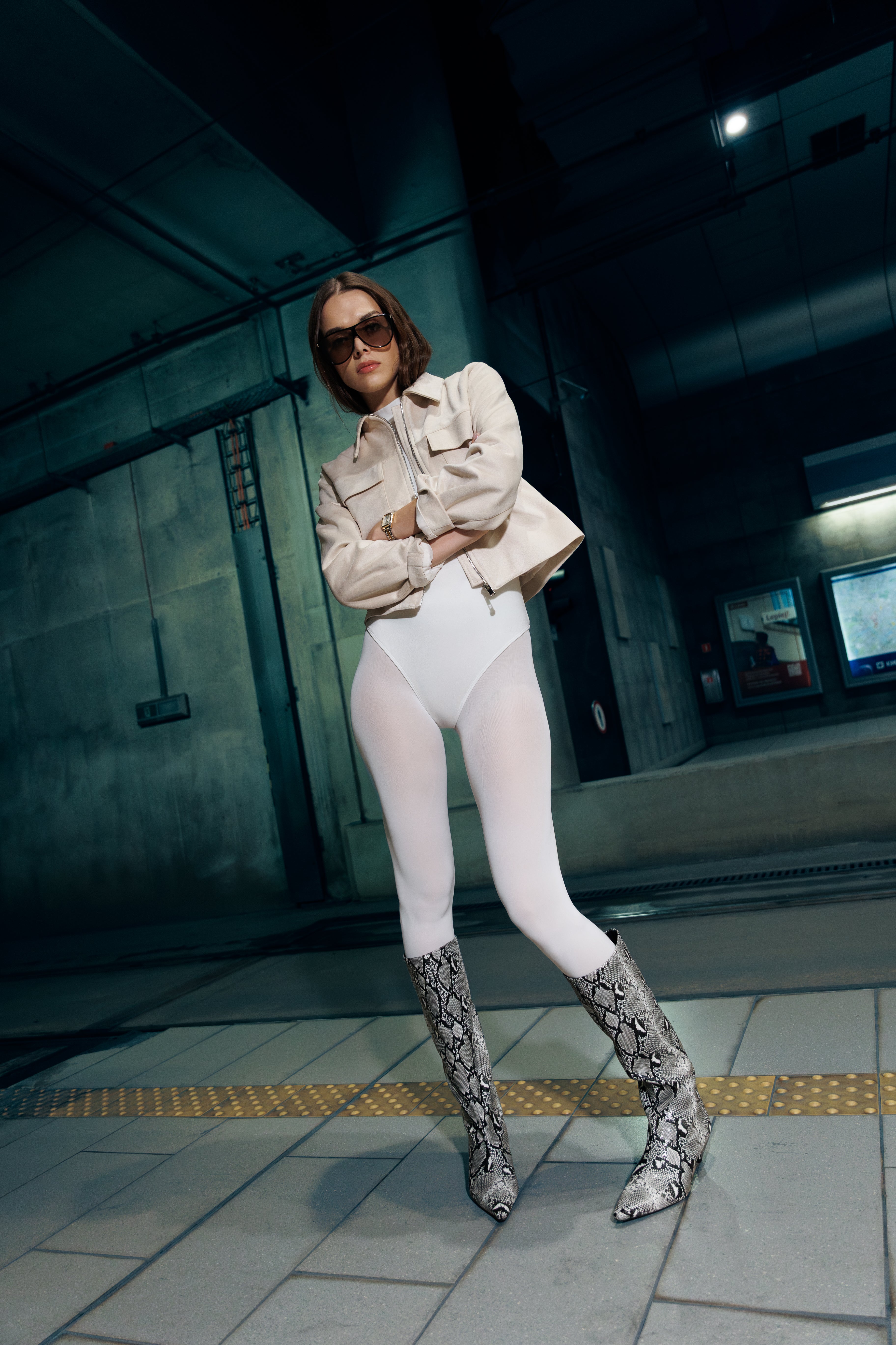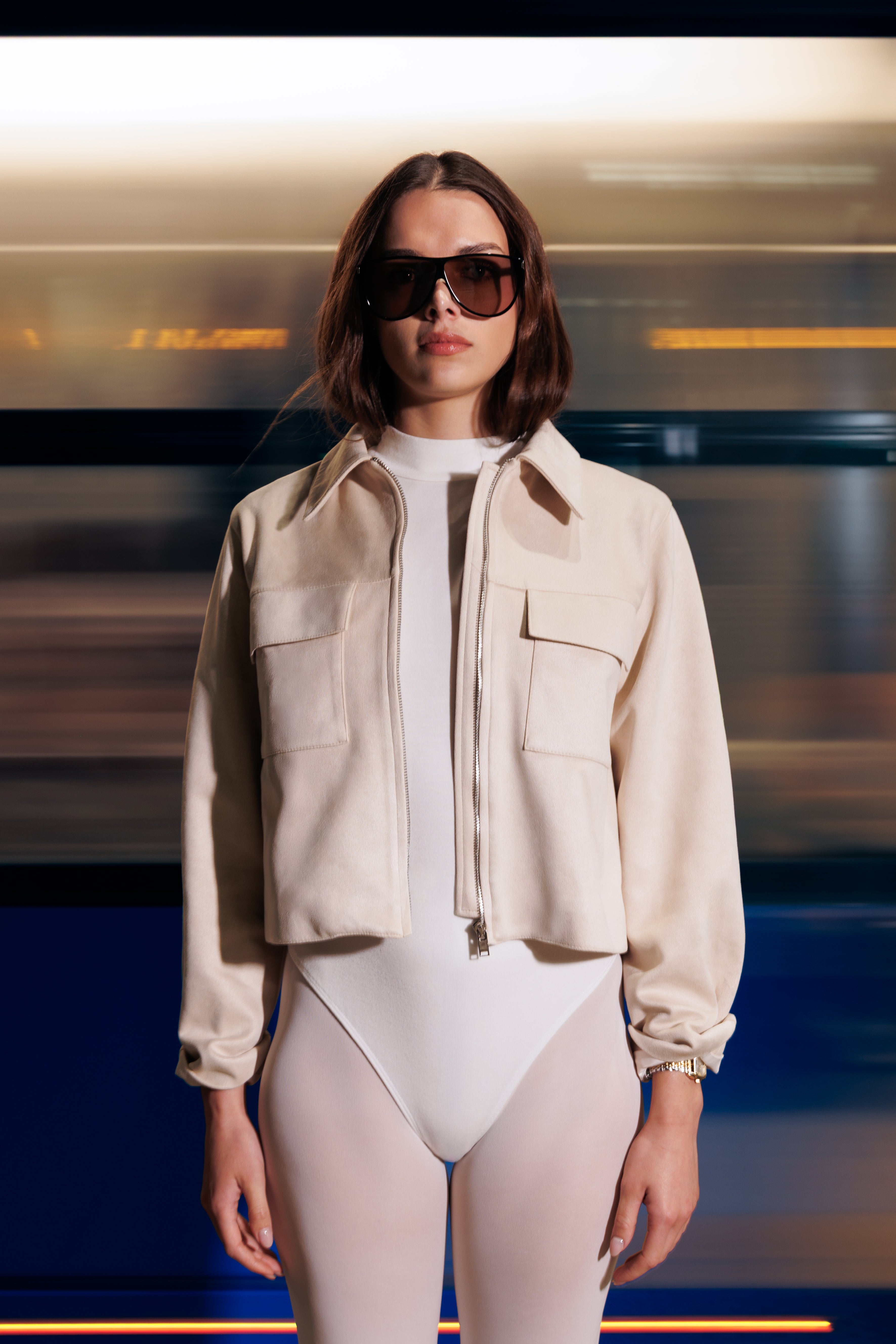 Chaqueta corta con textura de ante sutilmente brillante, confeccionada en una suave mezcla de algodón y viscosa. El material refleja suavemente la luz, creando un efecto nacarado y llamando la atención. Modelo con cremallera, cuello camisero clásico y dos bolsillos de parche en la parte delantera. Las mangas, con un ribete de construcción vertical, están rematadas con un puño recto para aportar equilibrio.
