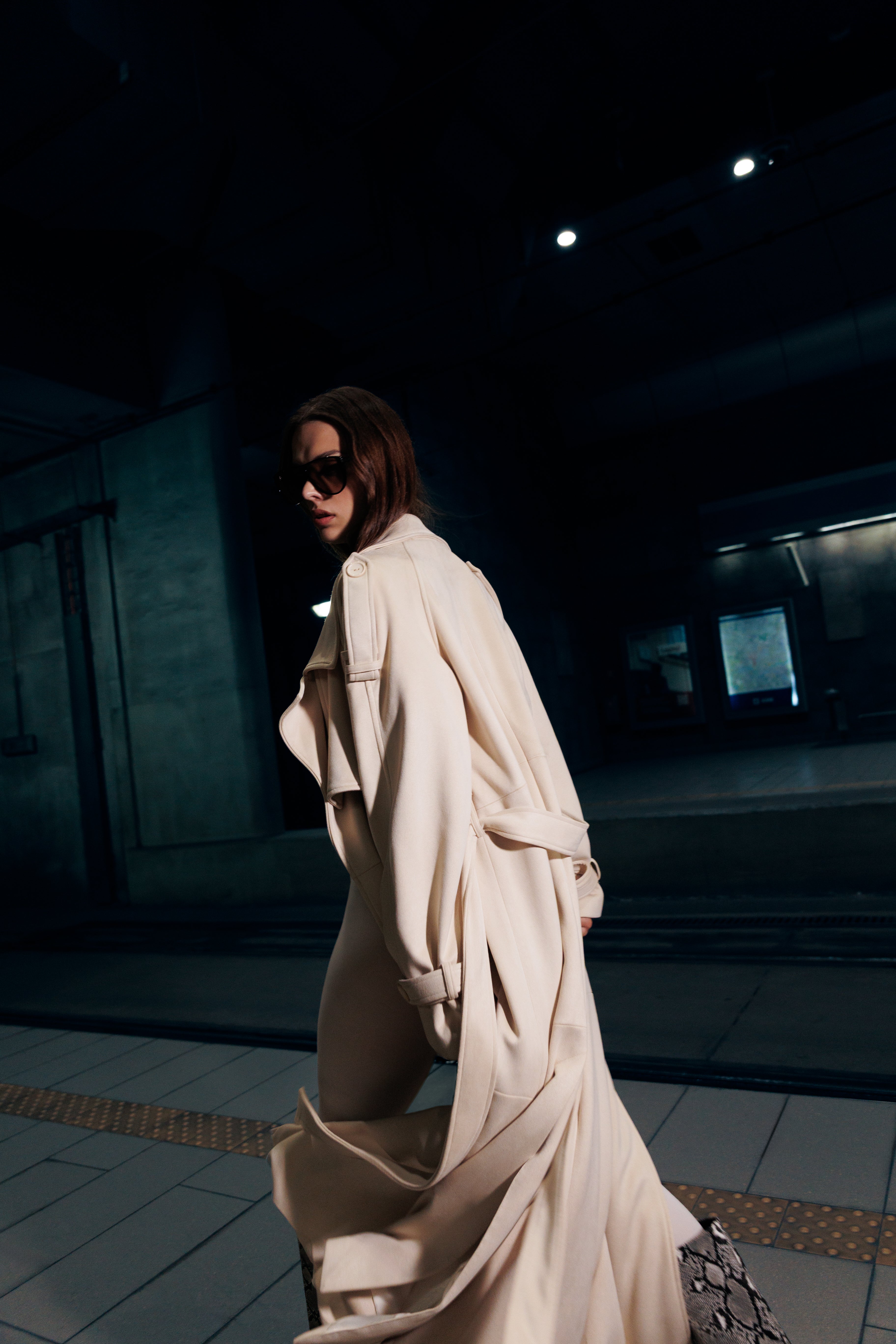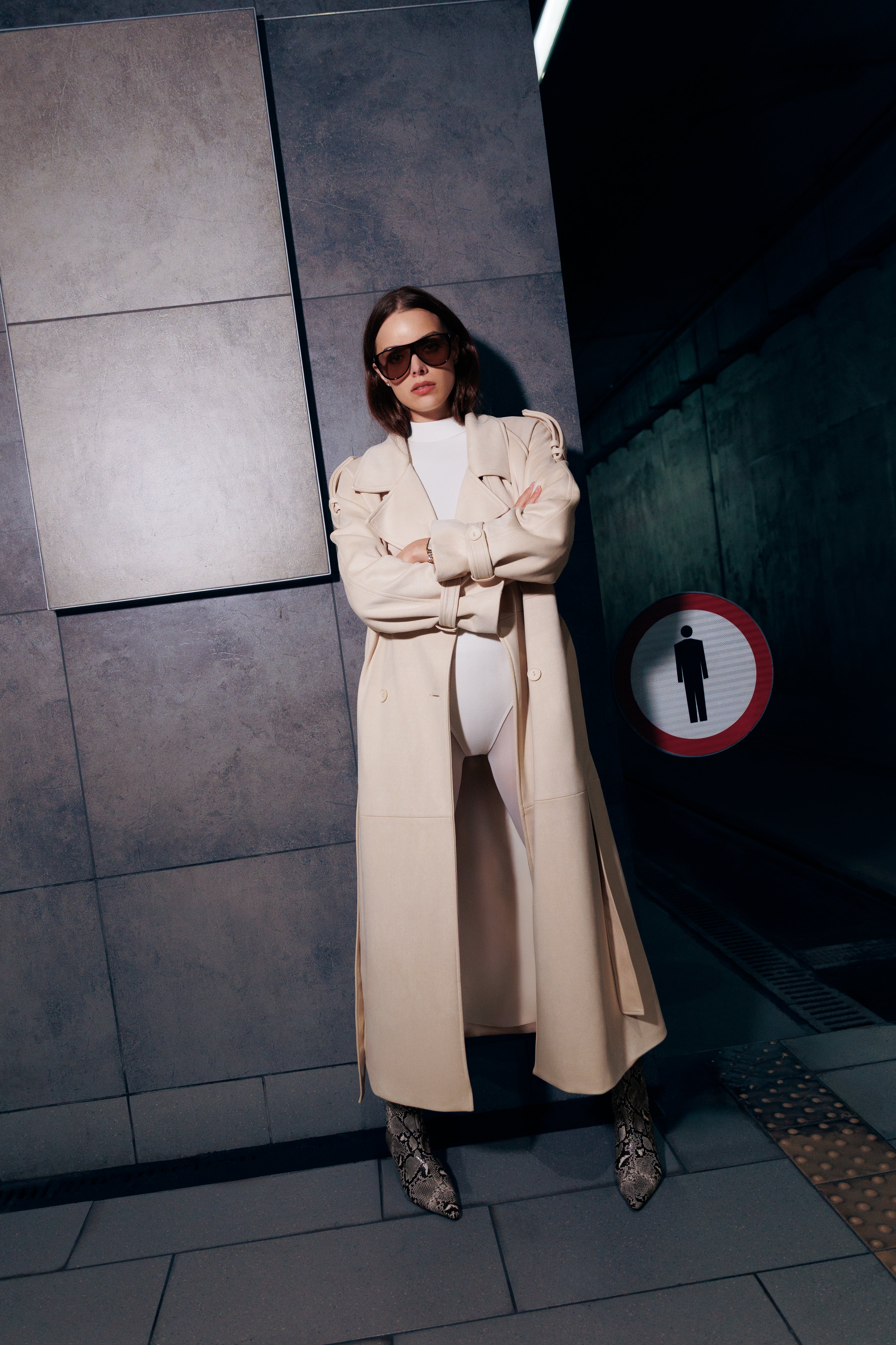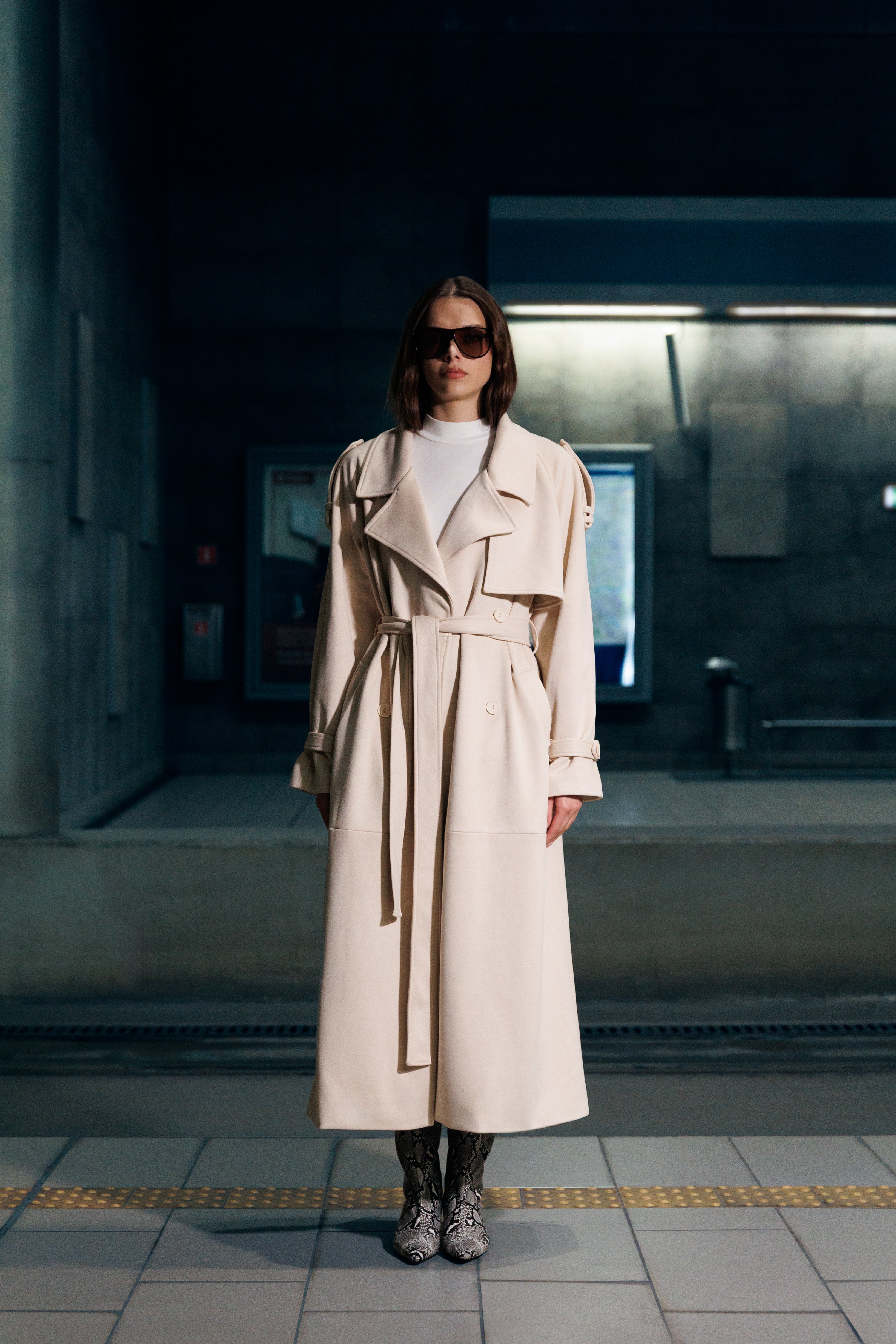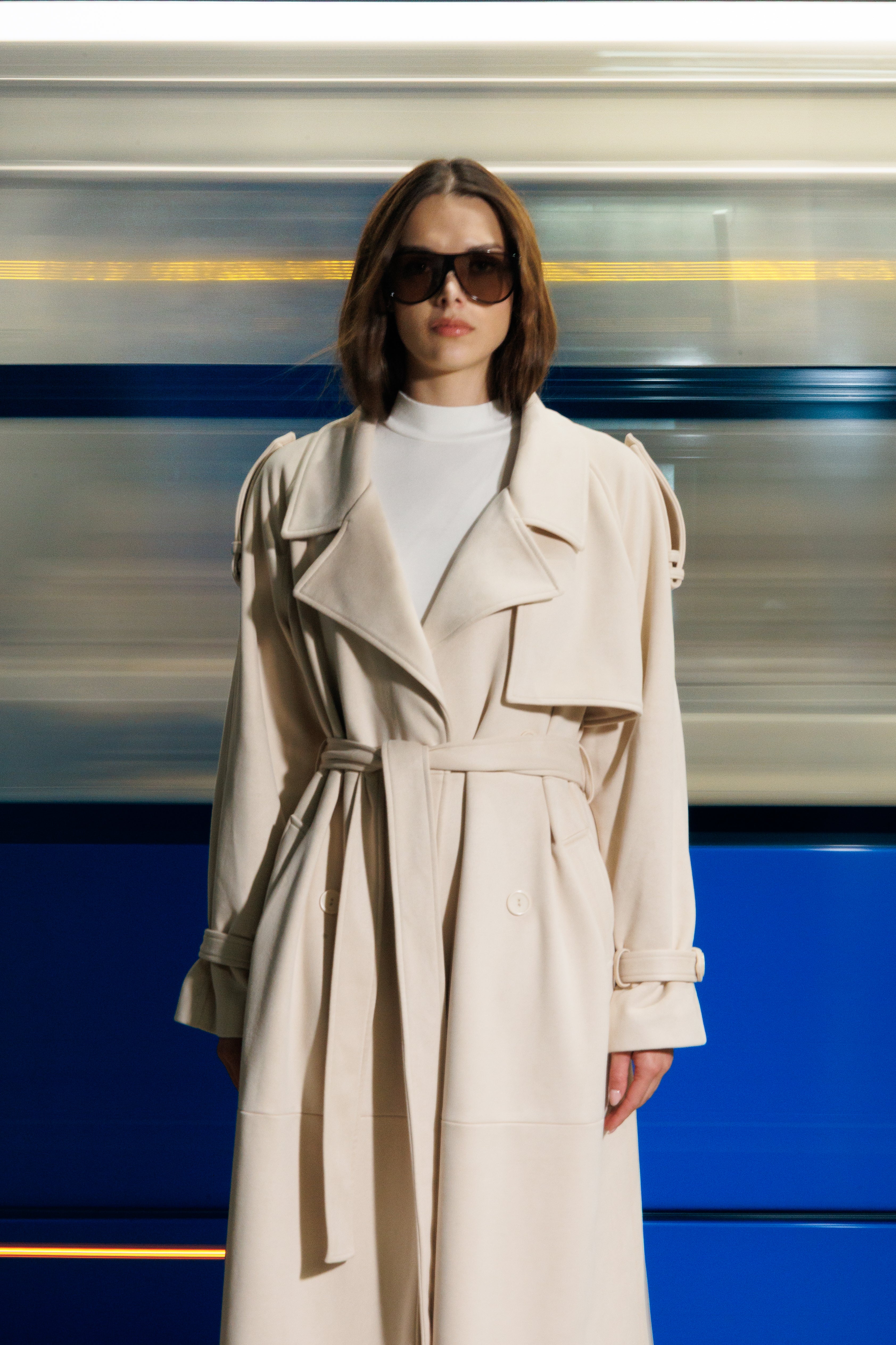 El modelo de largo a media pantorrilla, con solapas anchas, charreteras en los hombros y un ribete decorativo en forma de tormenta, mantiene las proporciones de un trench clásico. Se anuda a la cintura con un cinturón, tiene dos bolsillos laterales y cuatro botones en la parte delantera.