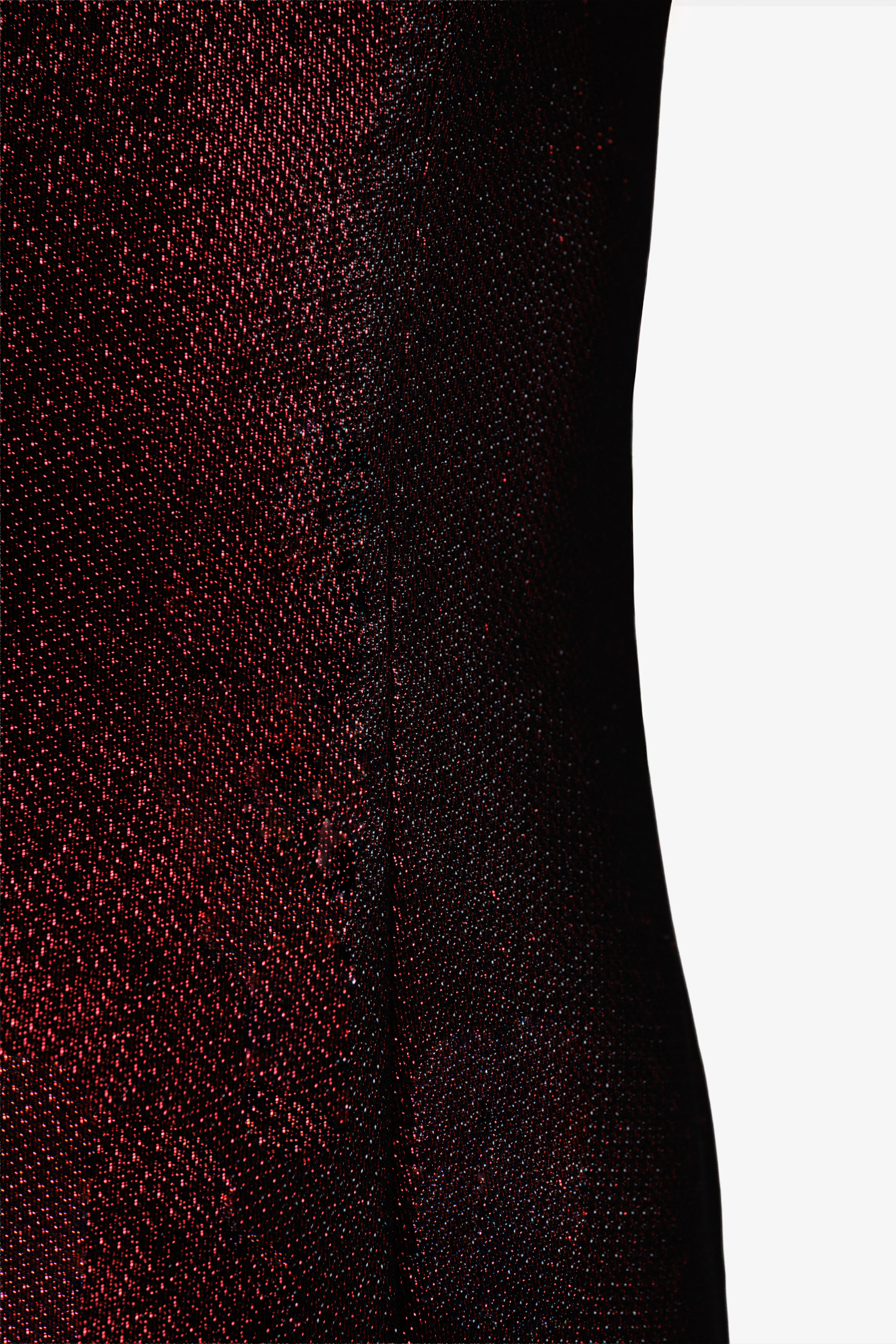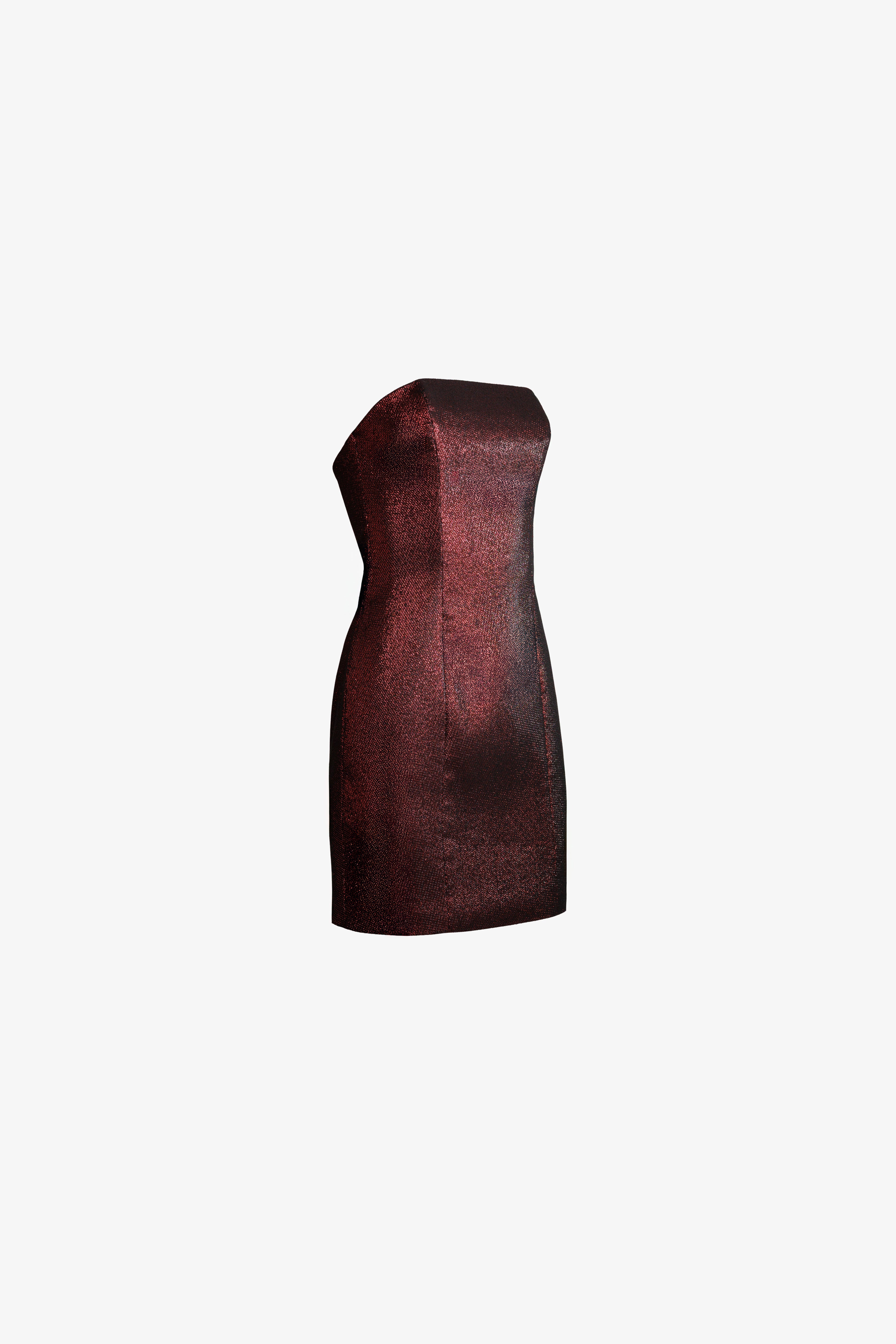 Un vestido de cóctel de forma corta basado en una construcción limpia y una línea estable que conduce la silueta desde el borde superior hasta el inferior. El modelo tiene forma de corsé sin tirantes y está creado a partir de un tejido bicolor en un tono rojo intenso que vira al negro. La superficie del tejido crea un sutil ritmo de luz que refuerza el recorrido vertical de las costuras y acentúa las proporciones.