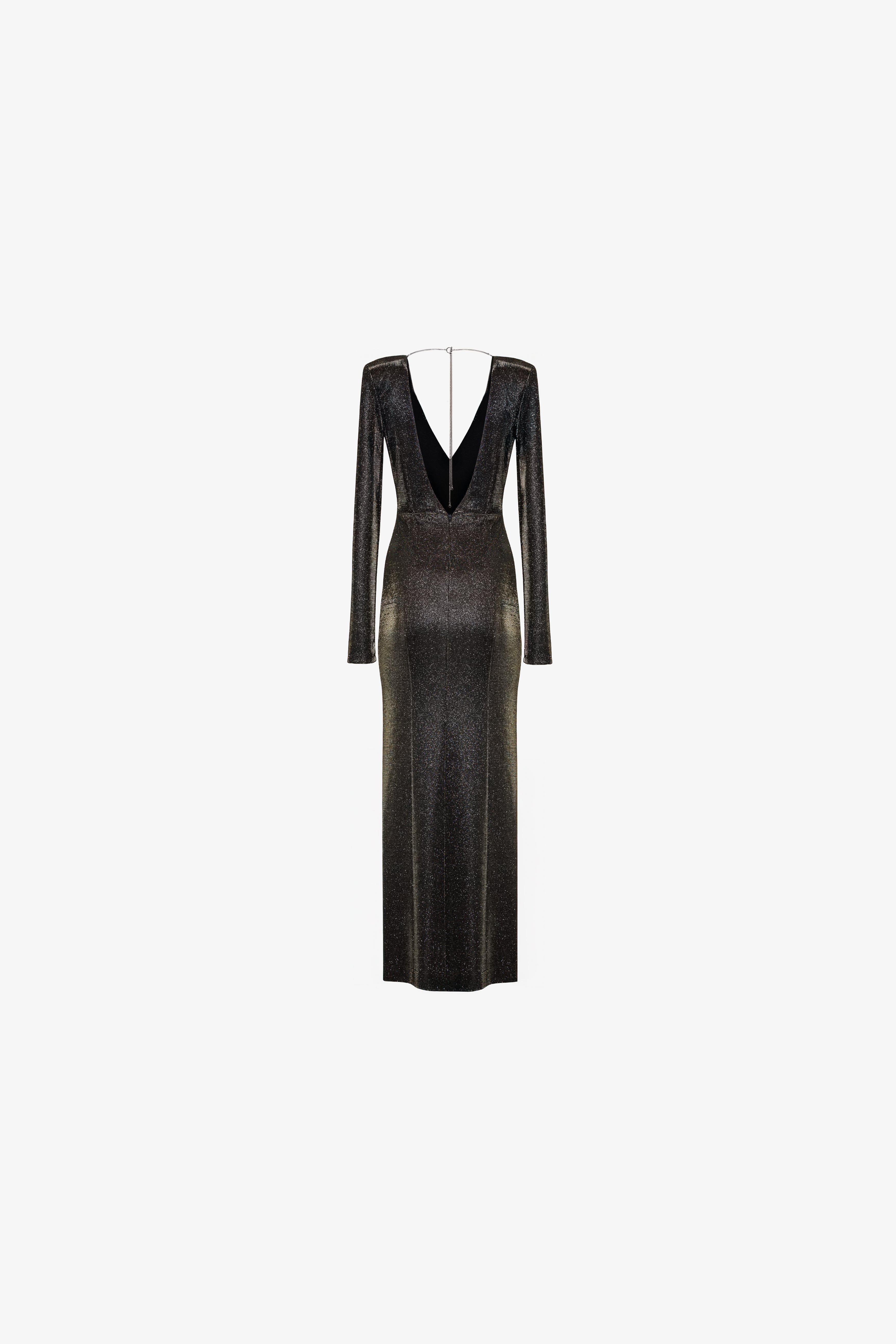 Las mangas largas equilibran la parte superior abierta, mientras que una abertura alta en la parte delantera introduce ligereza y ritmo al caminar. La espalda se cierra con una cremallera oculta. En la próxima iteración del diseño, el vestido se completará con un detalle de cadena que cierra la línea de la espalda y cae libremente a lo largo de la silueta.