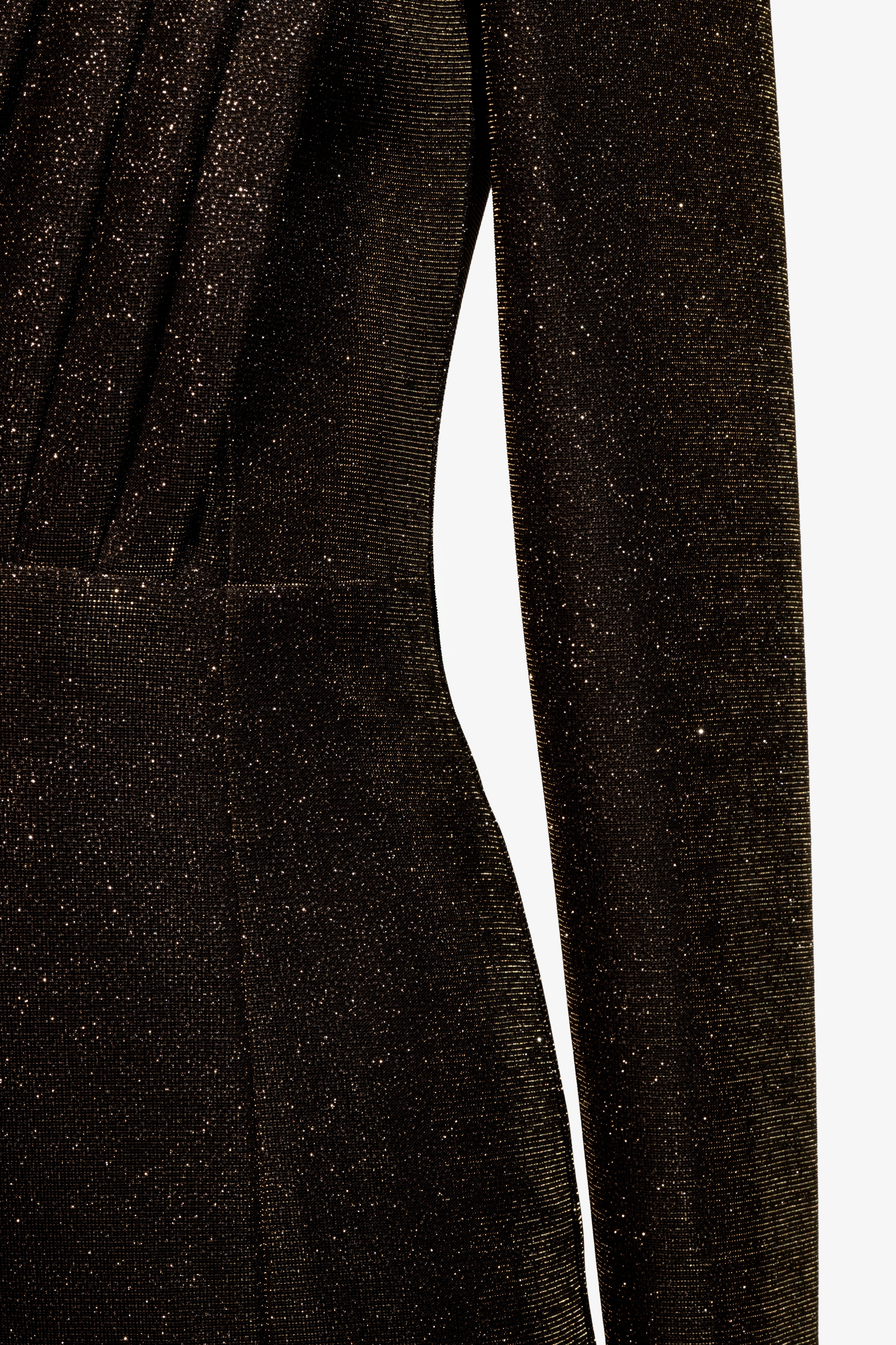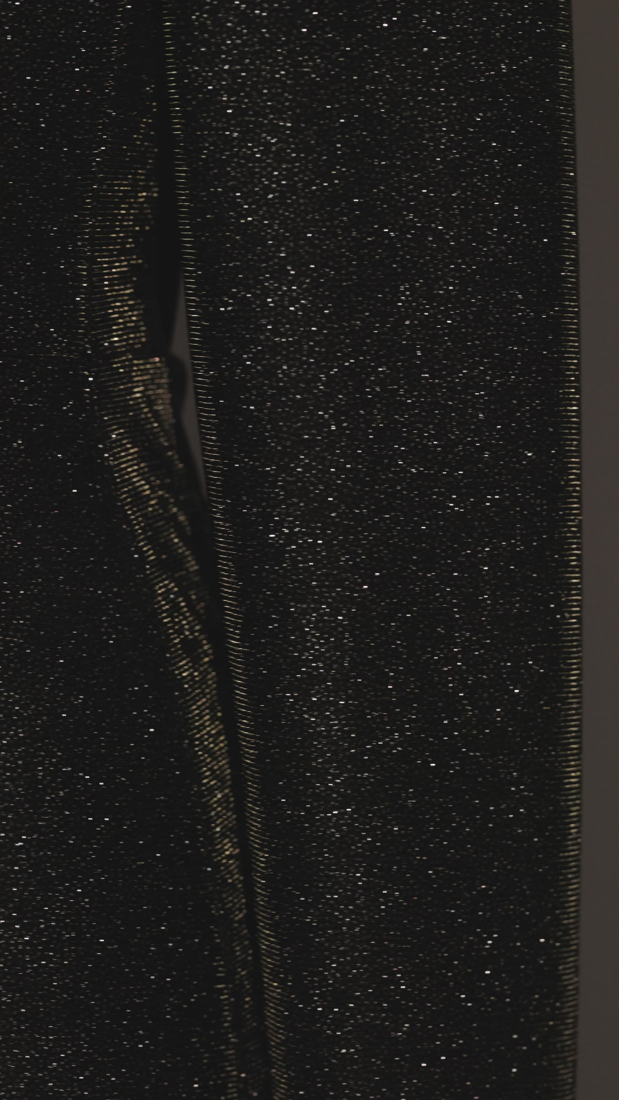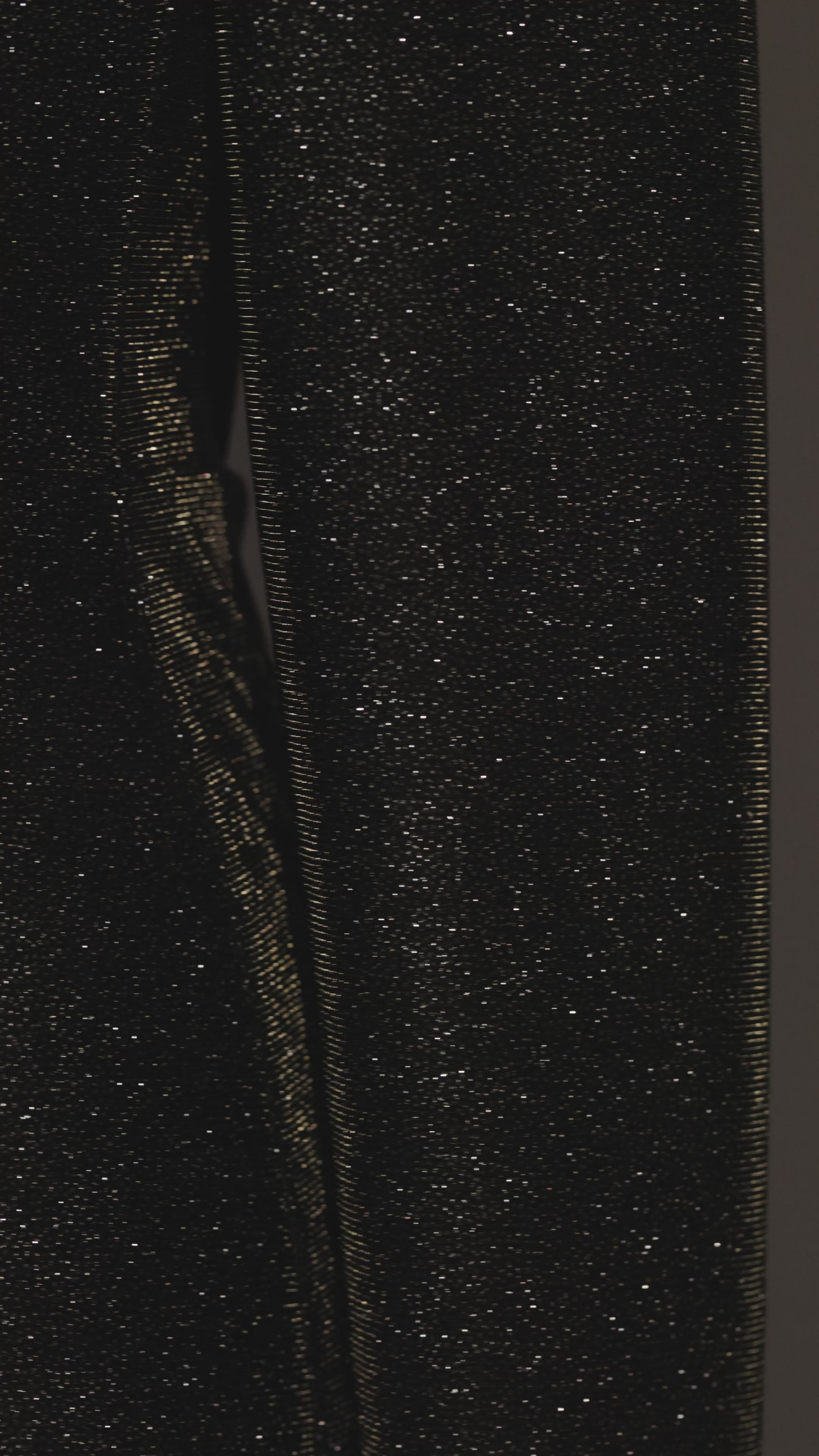 El tejido es bicolor y reacciona a la luz, pasando del negro al dorado y a sutiles tonos plateados. La estructura metálica basada en un fino acolchado crea un efecto de microcristales. El tejido se ciñe al cuerpo y mantiene la forma tanto en reposo como en movimiento.