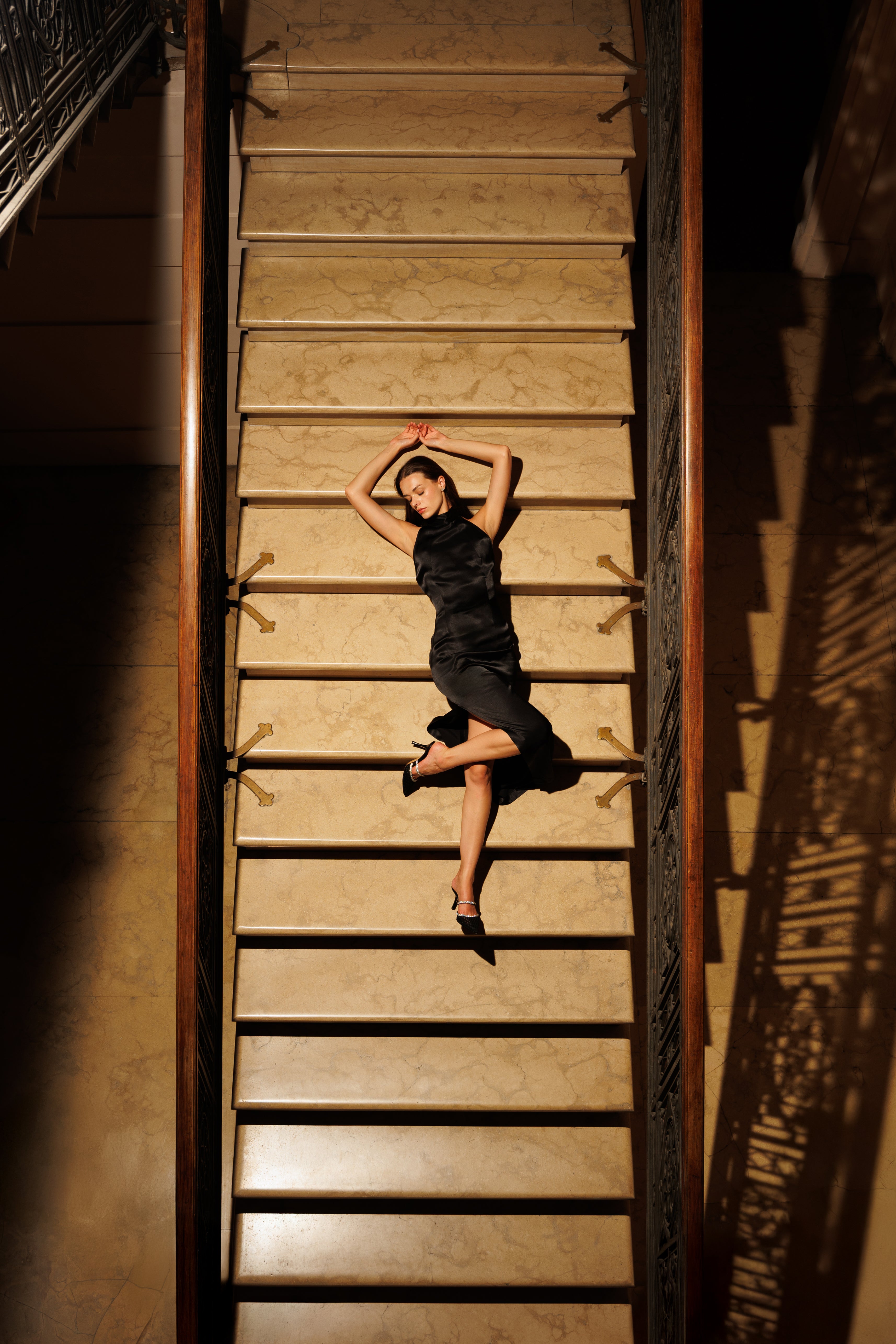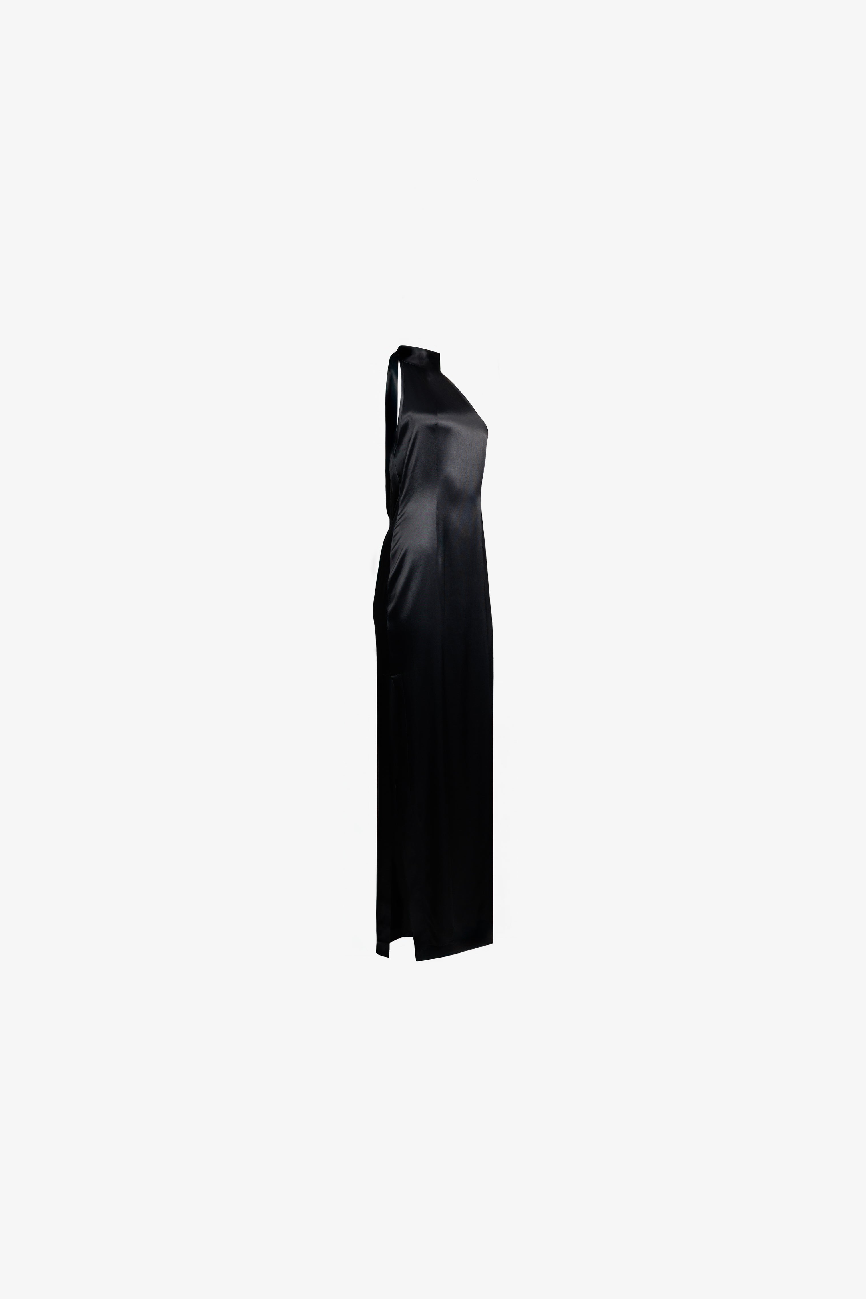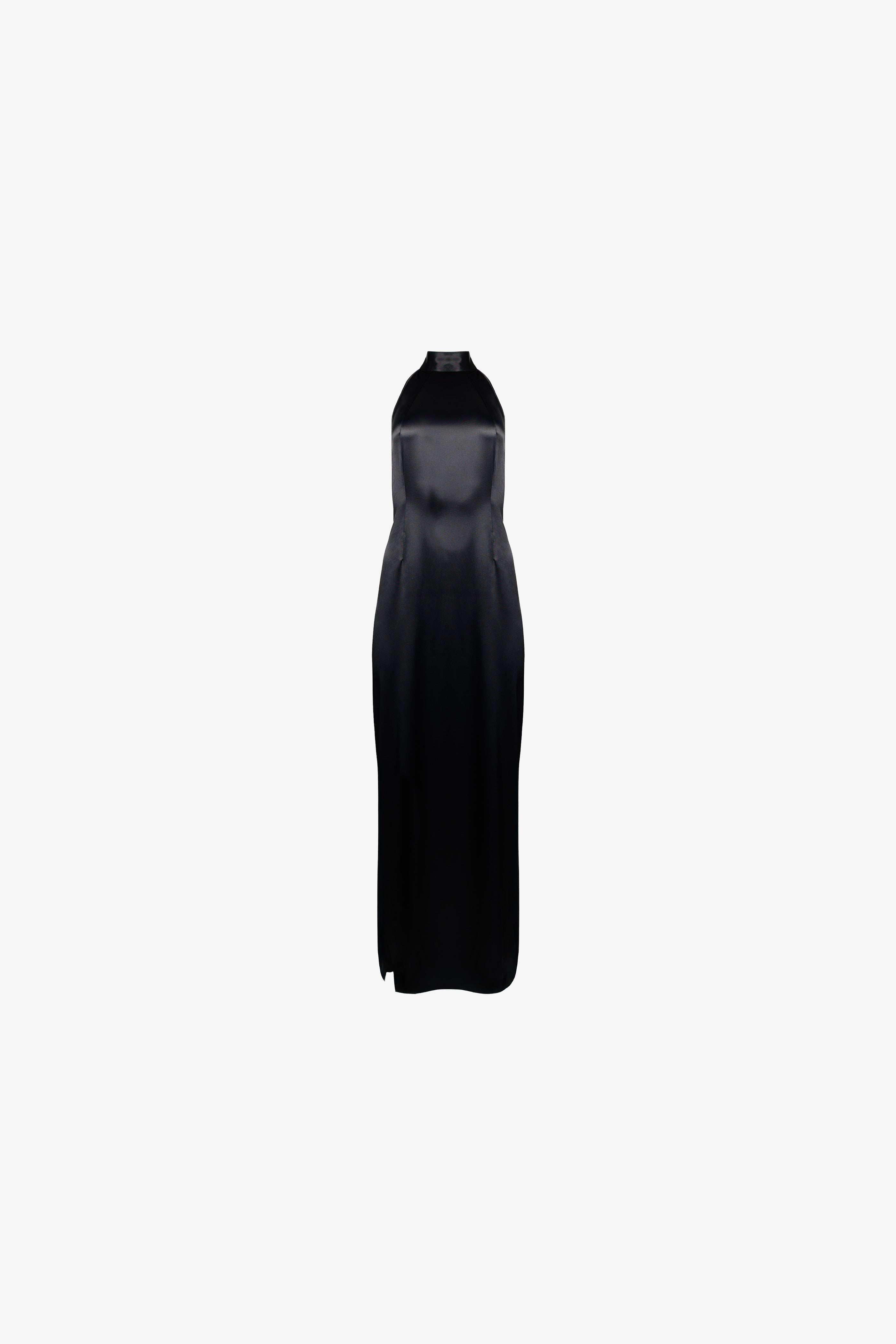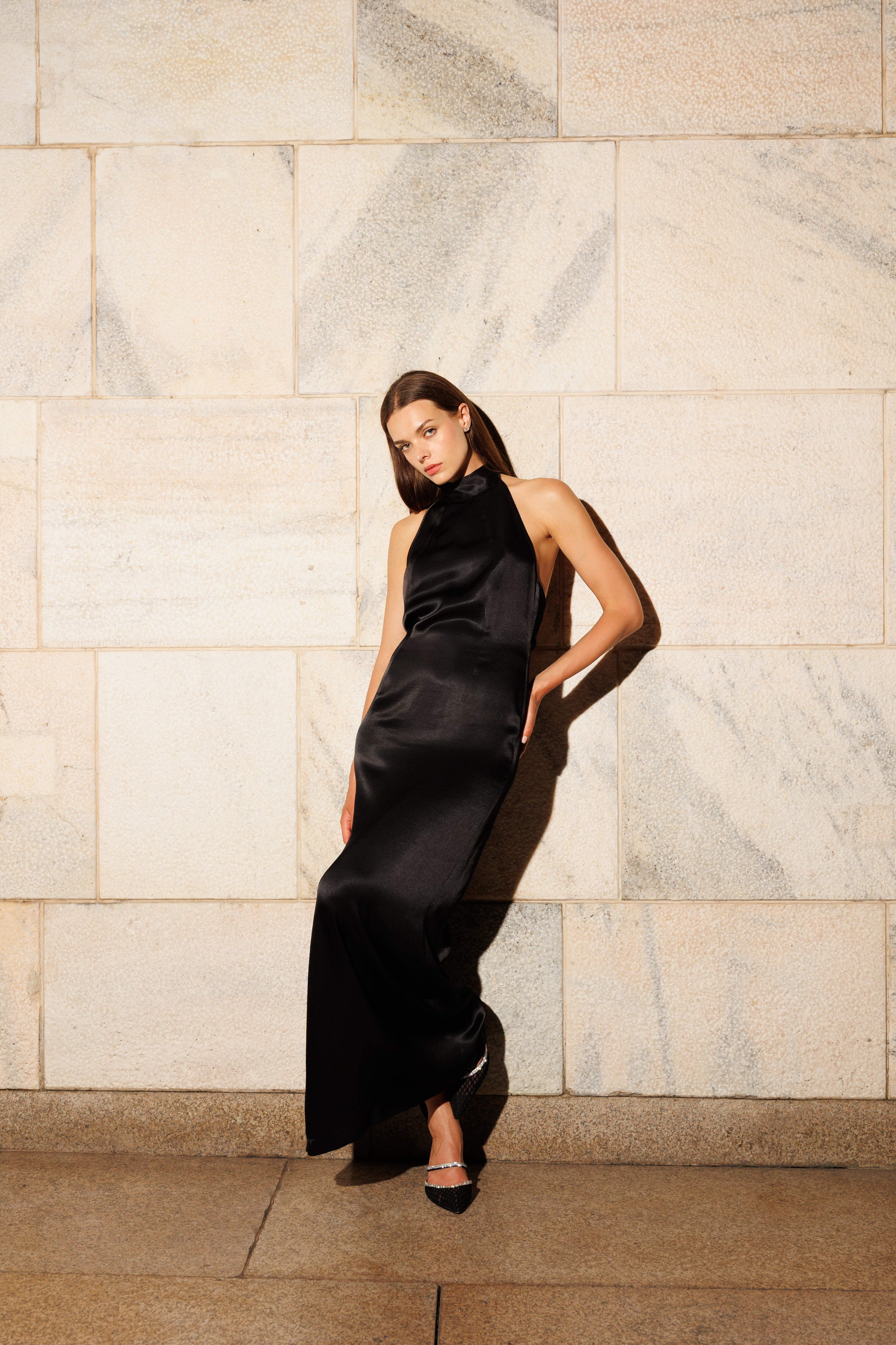 Suknia maxi o czystej, wydłużonej linii, uszyta z satynowej tkaniny wiskozowej z dodatkiem elastanu, która miękko pracuje z ruchem ciała i subtelnie odbija światło. Zabudowany przód kontrastuje z głębokim wycięciem na plecach, opadającym do trójkąta na wysokości bioder, co nadaje formie wyważone napięcie zmysłowe.