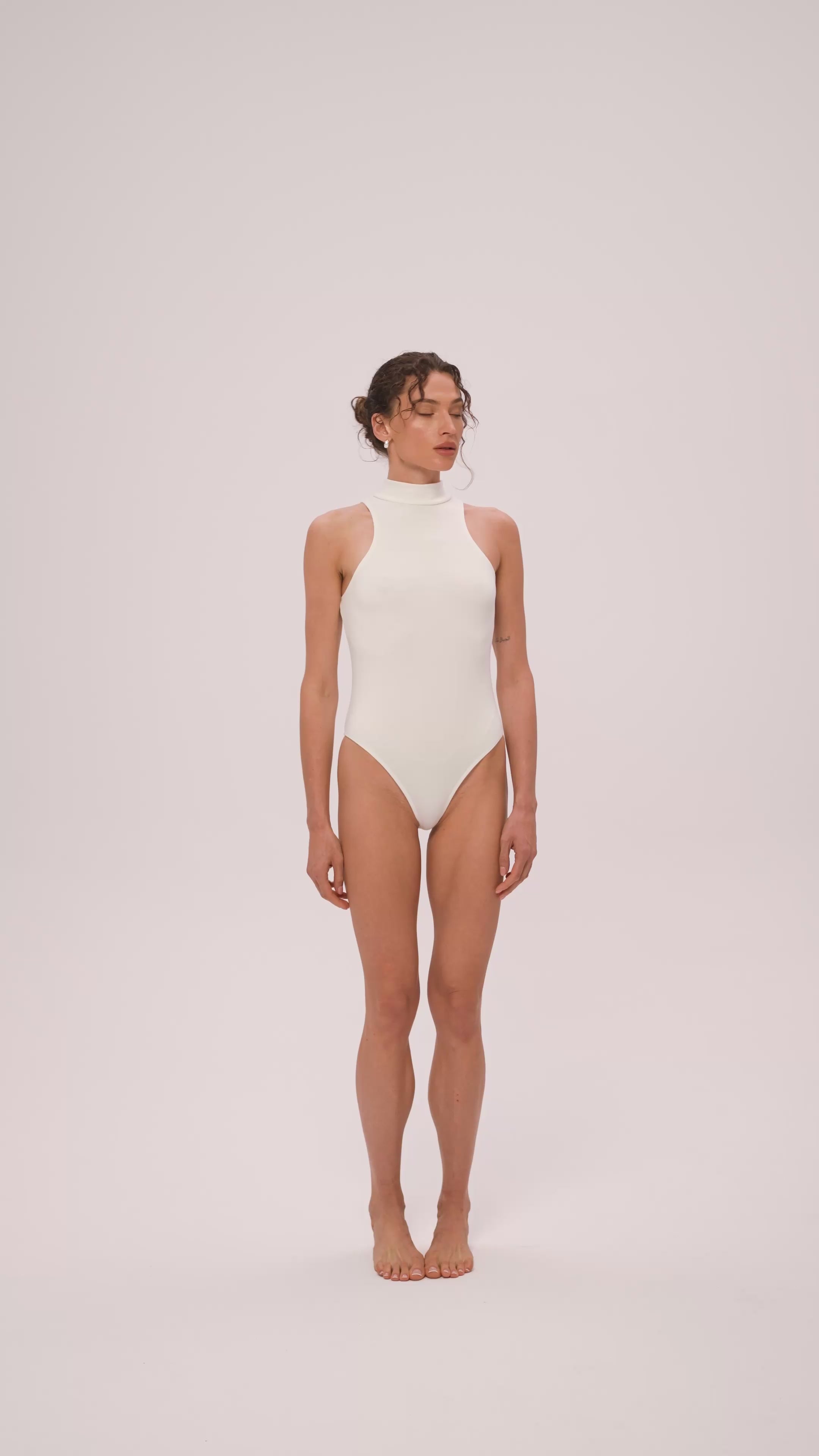 Un modello che introduce una linea verticale di tensione e forza compositiva attraverso un collo alto e morbidamente avvolgente, mantenendo un ritmo sensuale della silhouette grazie a tagli laterali accuratamente studiati, posizionati all'altezza del busto, che costruiscono una moderna cornice del corpo e danno l'impressione di leggerezza nelle parti inferiori. Realizzato in viscosa morbida ed elastica con un tocco di elastan, il body rimane impercettibile grazie alla precisione delle cuciture, rifinite in ogni dettaglio e chiuse da due sottili bottoni a pressione per il comfort quotidiano.