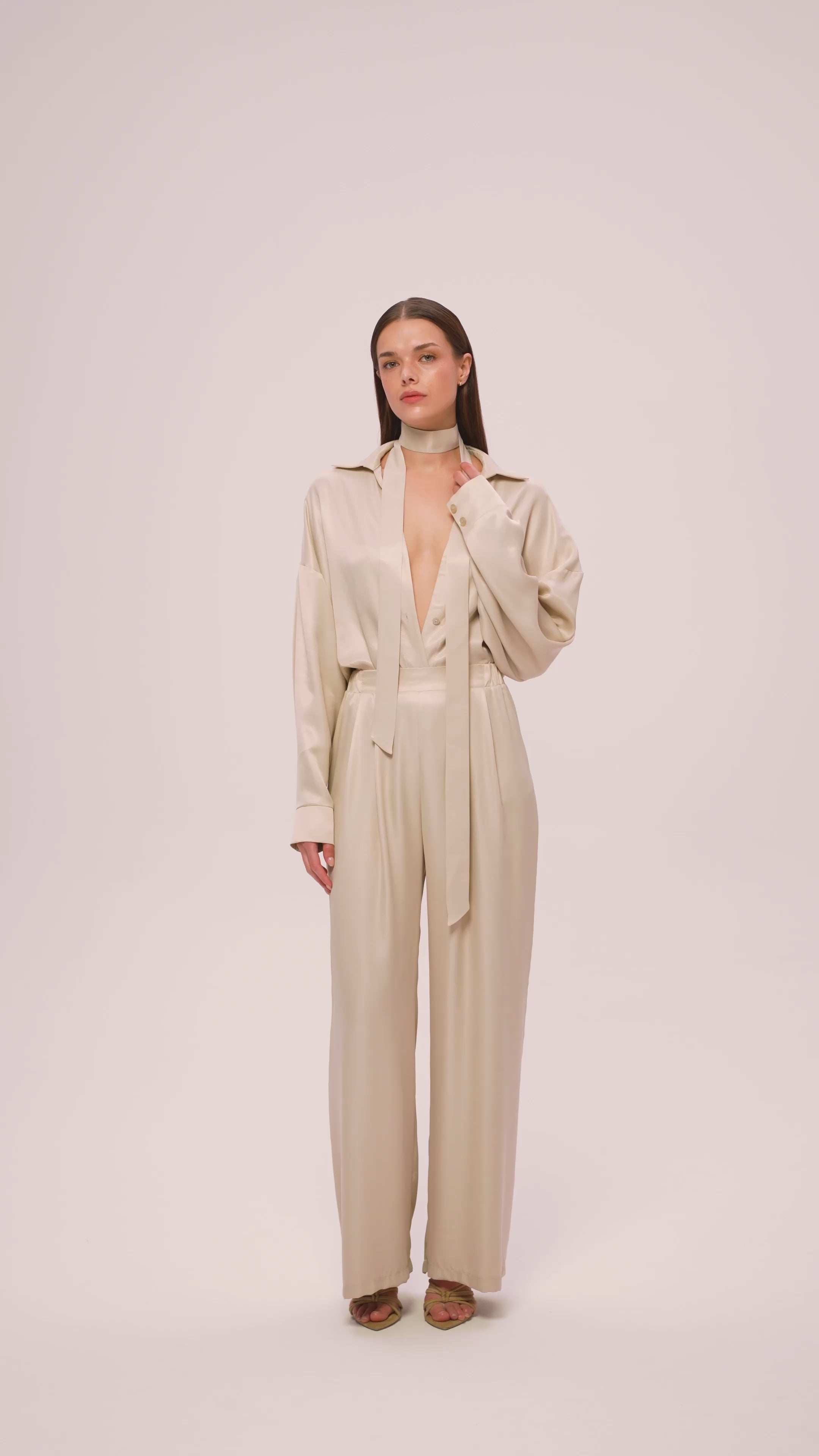 La fusciacca completa la camicia, realizzata in puro raso di viscosa di peso elevato che consente di creare innumerevoli varianti di stile, per cui può essere indossata in vita, legata al collo o lasciata come accento casual per allungare la linea della silhouette.