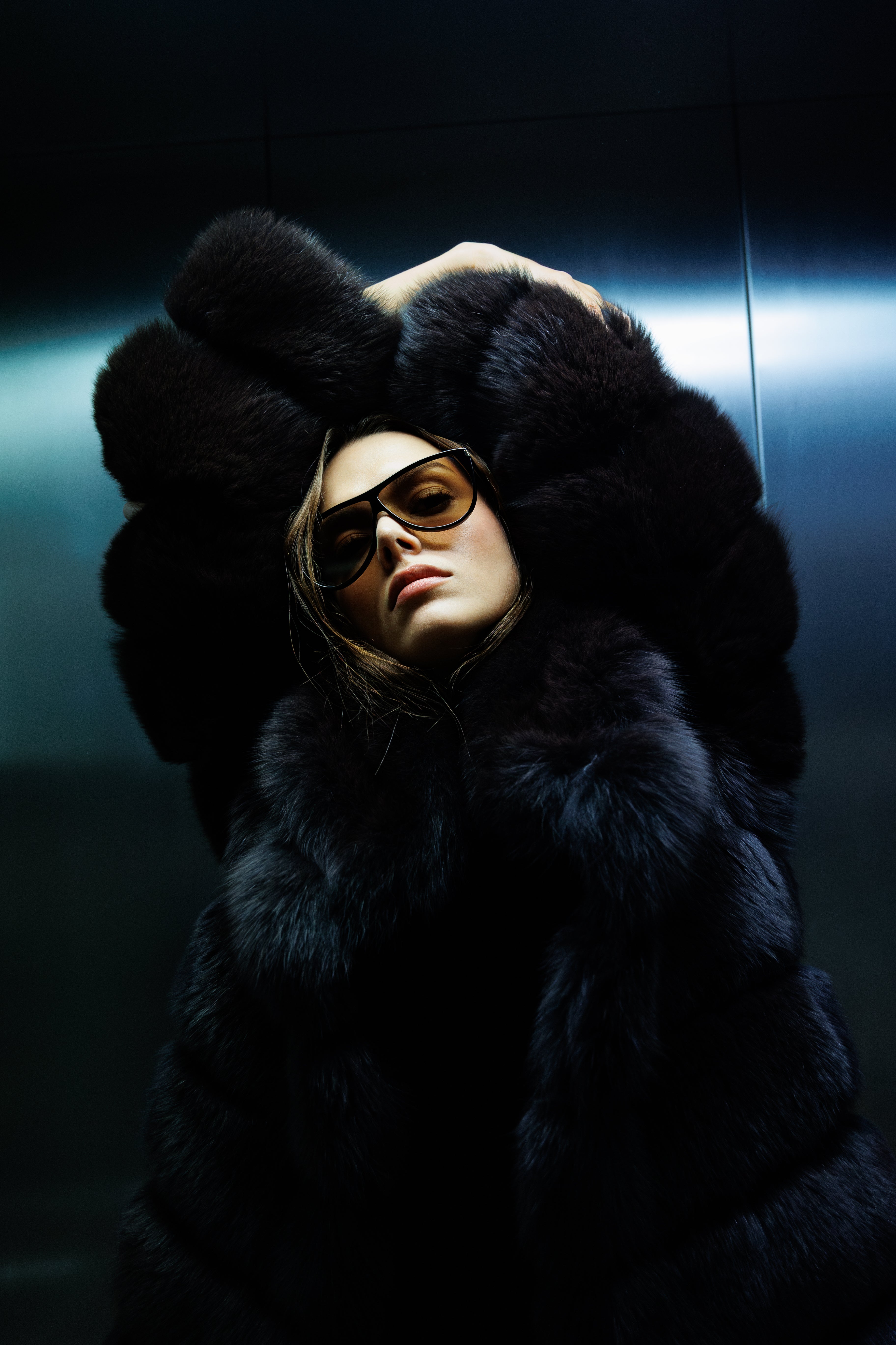 Futro wykonane z naturalnego lisa w głębokim, czarnym odcieniu, zaprojektowane w formie poziomych segmentów, które nadają sylwetce architektoniczną lekkość i rytm.
