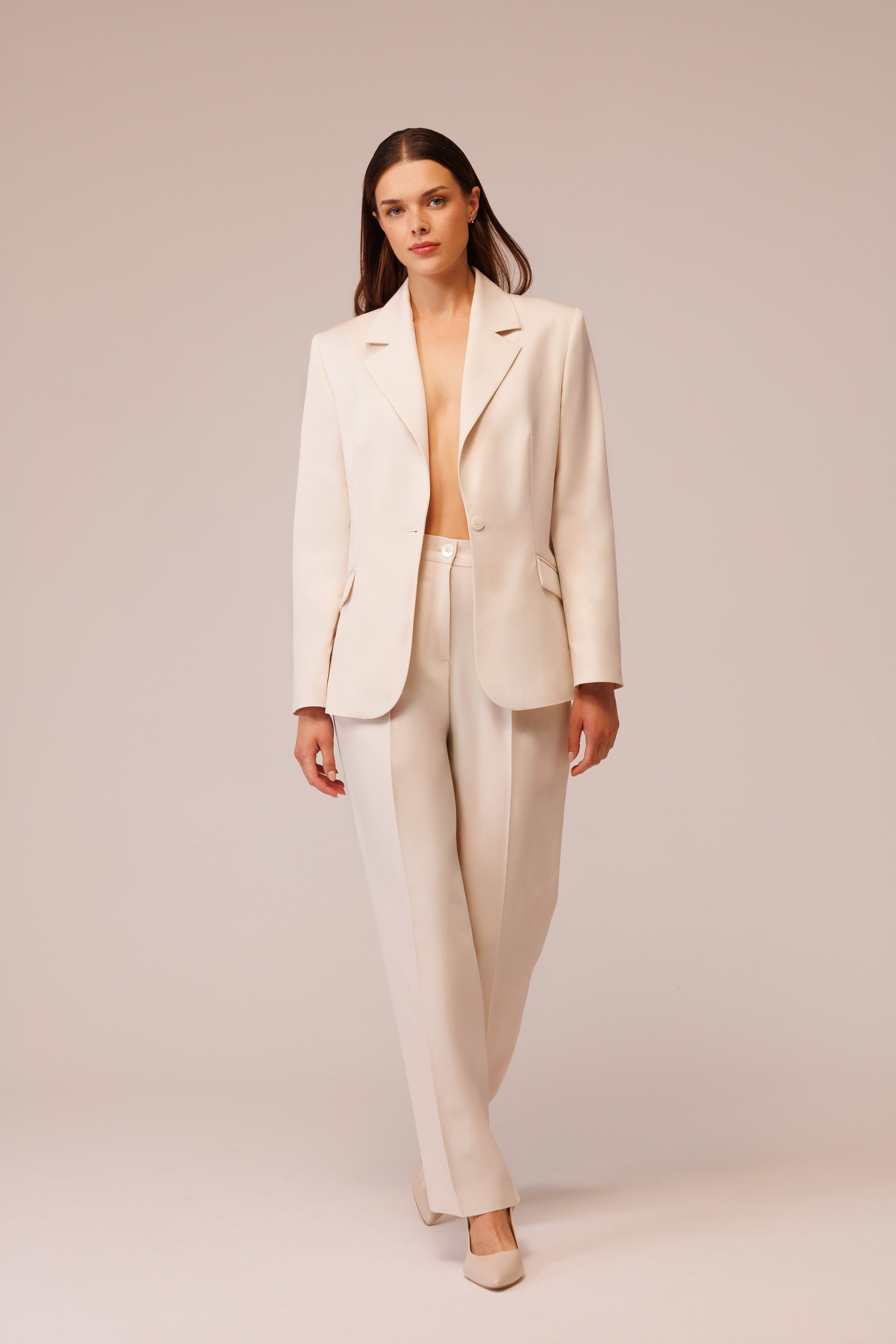 Długie spodnie o szerokiej, prostej nogawce, zaprojektowane z myślą o nowoczesnej, wyważonej elegancji, zbudowanej na wyraźnej formie i subtelnej miękkości tkaniny. Z przodu zaplanowano zakładki po obu stronach, precyzyjnie stebnowane od linii pasa, których rytm porządkuje sylwetkę i wprowadza architektoniczną logikę kompozycji, natomiast kantka poprowadzona wzdłuż nogawki tworzy pionową oś, która optycznie wydłuża linię nóg i wzmacnia wyrafinowanie projektu.