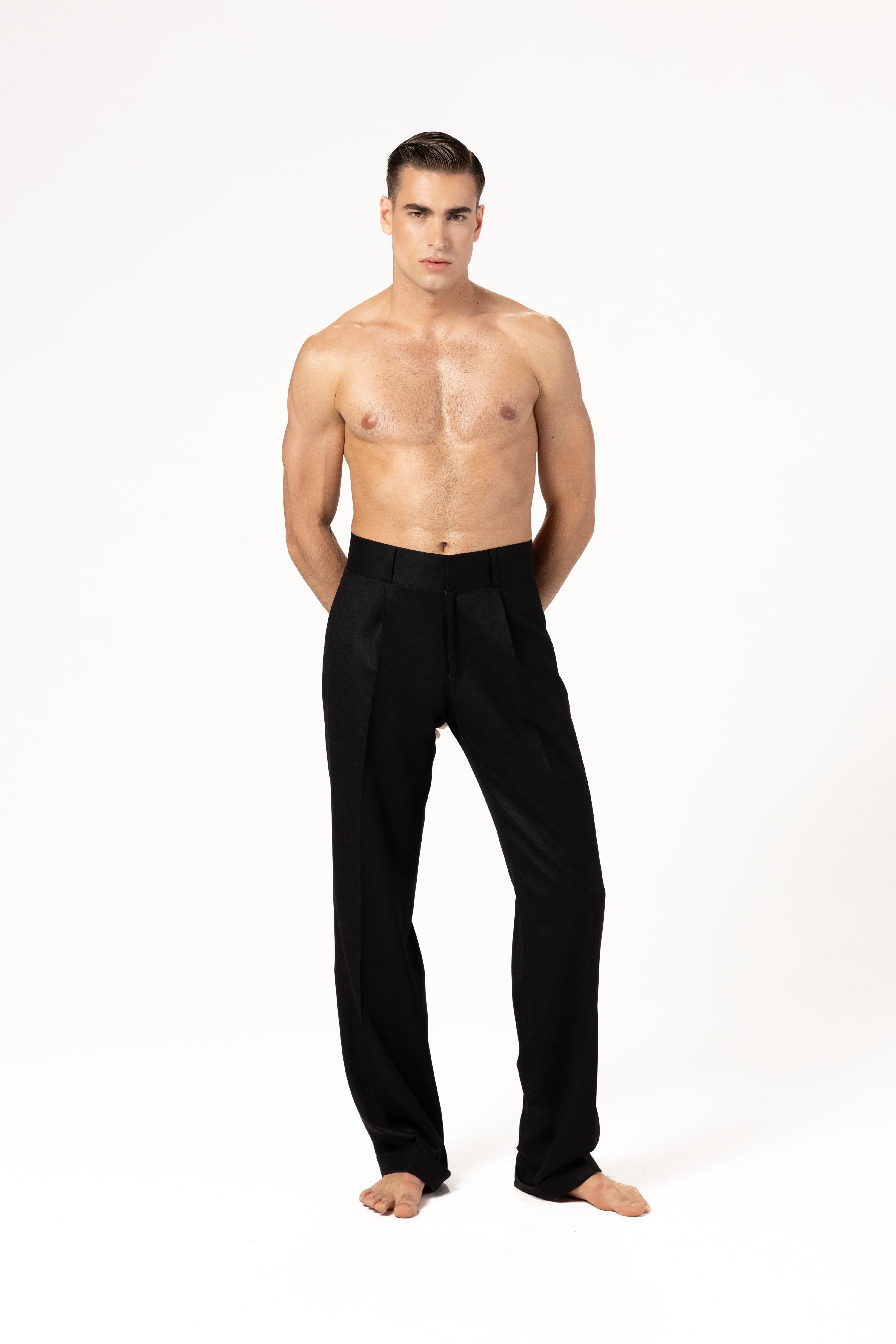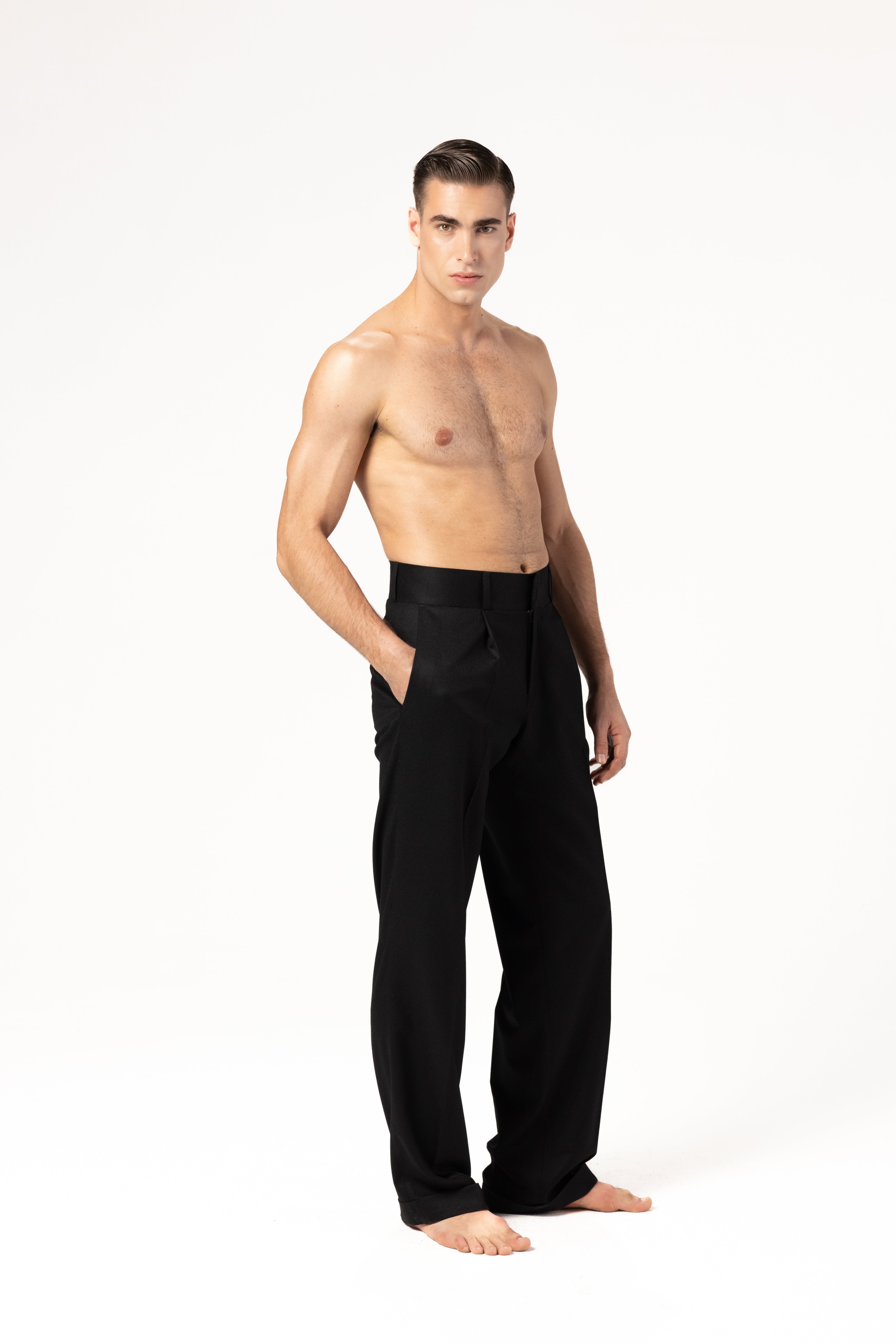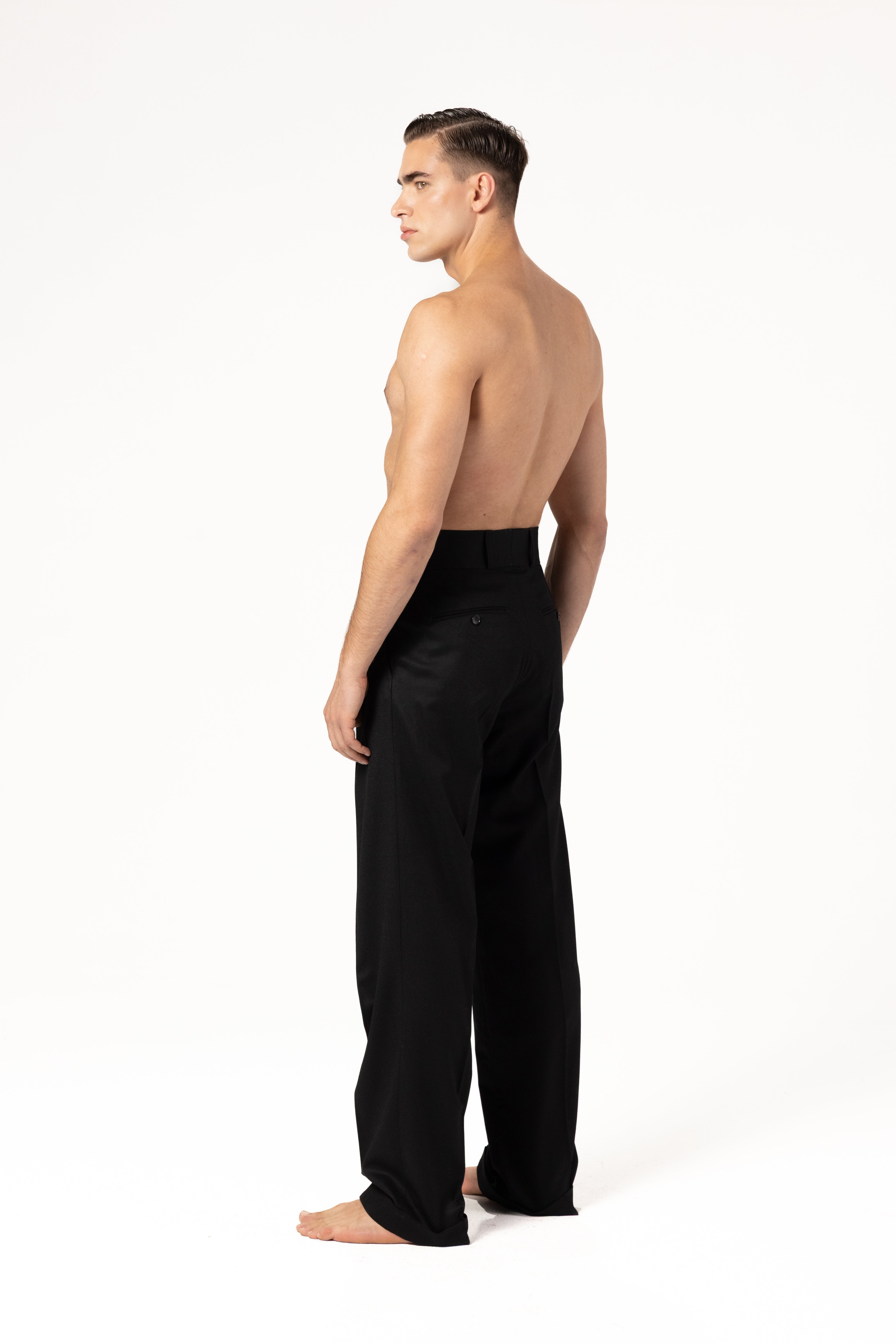Wysoki pas górą cięty, zapinany na dwa haki, stabilizuje linię talii i podkreśla konstrukcyjny charakter modelu. Nogawki z wyraźną kantką oraz mankietem u dołu nadają całości czysty, zdecydowany rytm. Z tyłu zastosowano dwie kieszenie wpuszczane, a całość dopełnia staranne wykończenie wnętrza lamówkami oraz dopracowany podkrój, który podnosi komfort noszenia i estetykę wykończenia.
