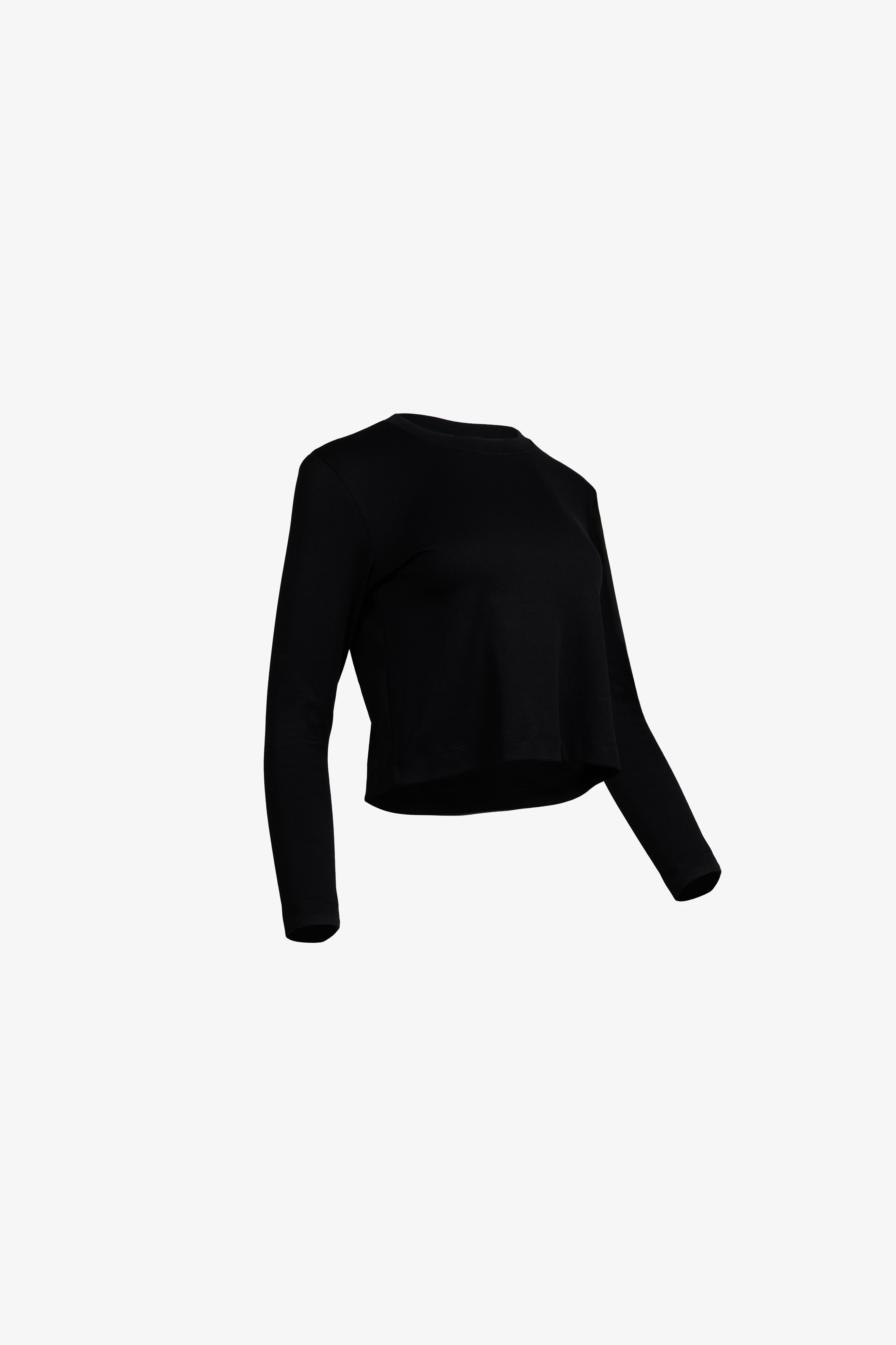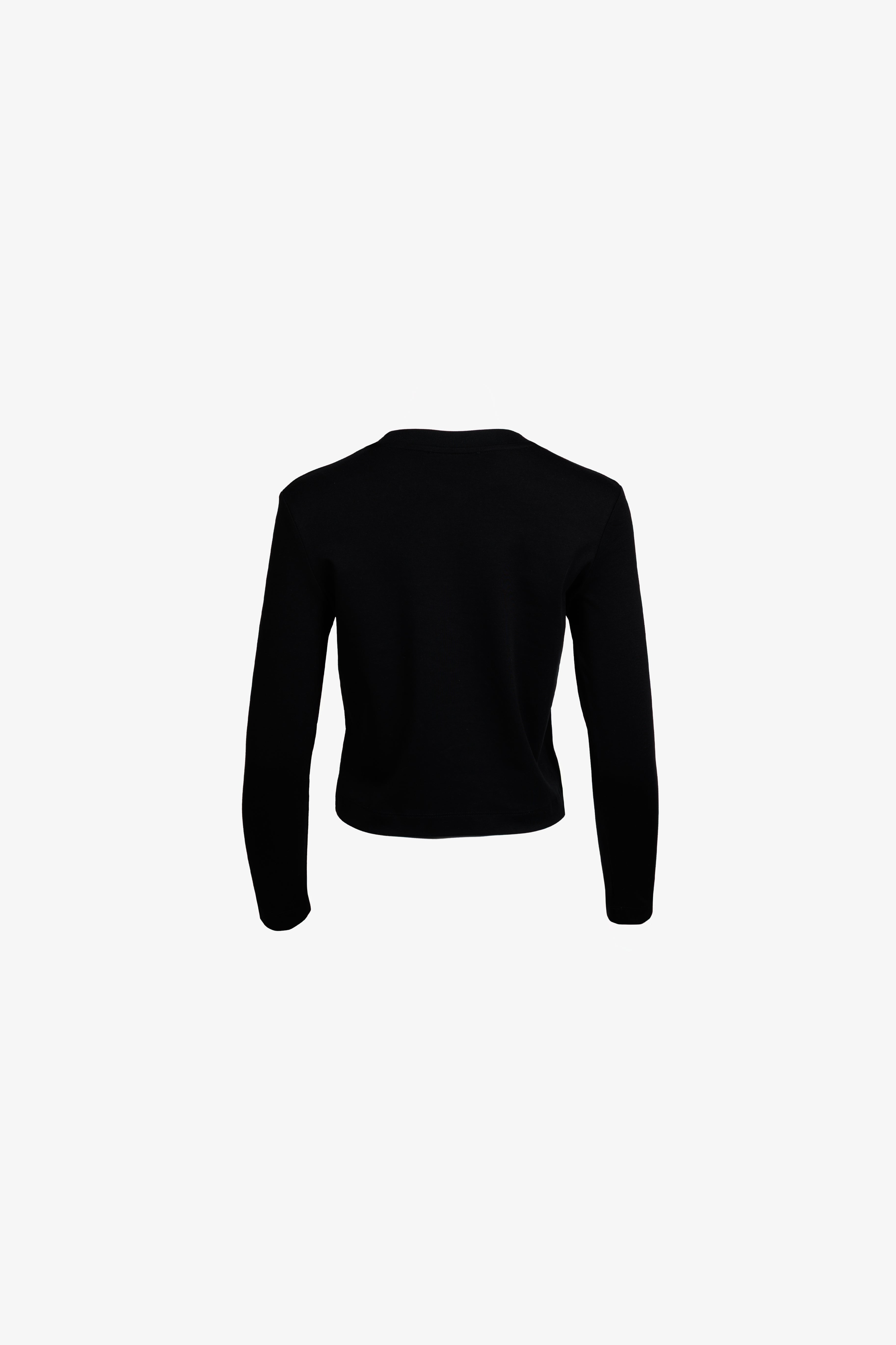 Prosty, klasyczny krój o lekko skróconej długości został uzupełniony precyzyjnie wykończonym dekoltem oraz rękawami, które układają się blisko ciała, nie tracąc miękkości w ruchu.