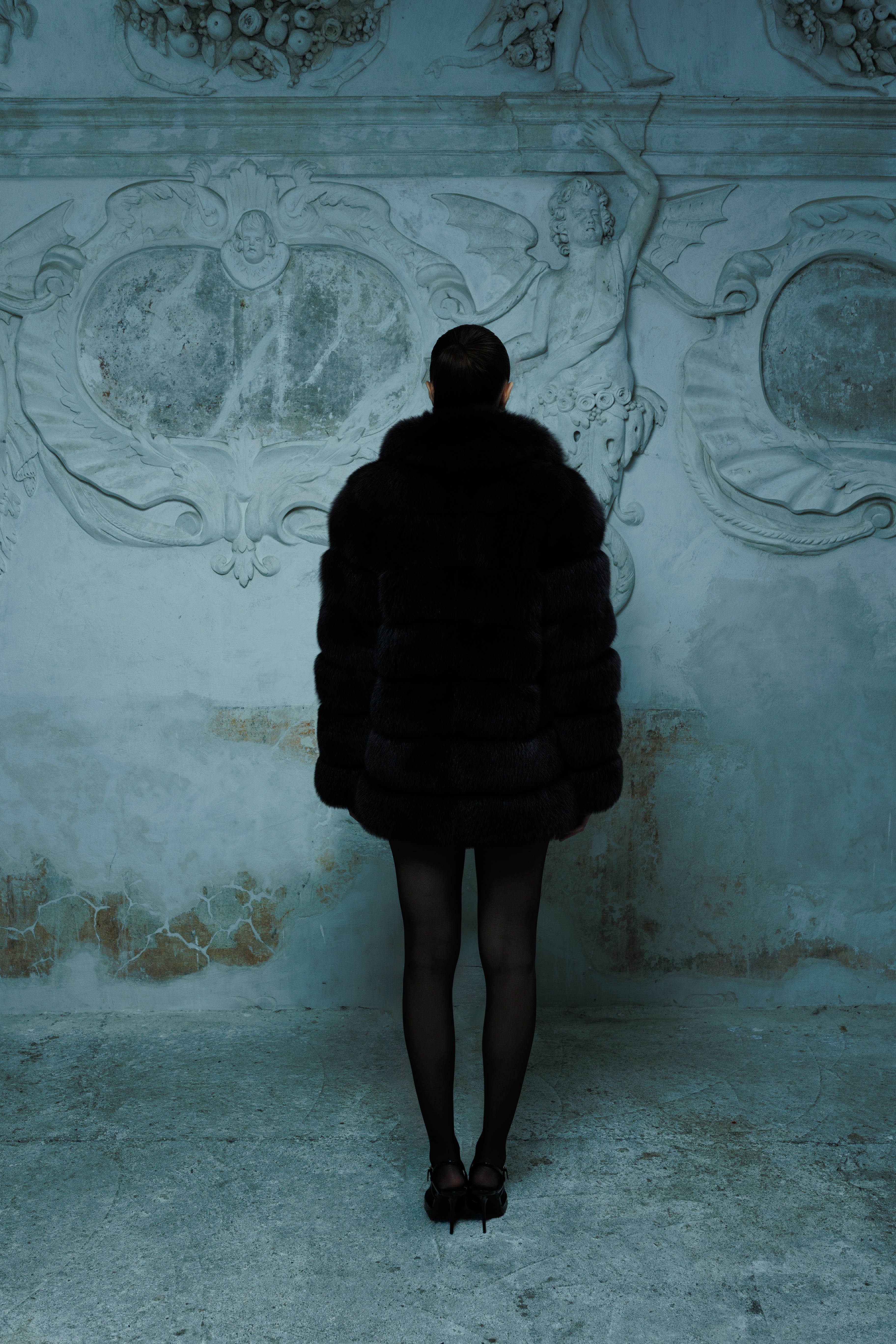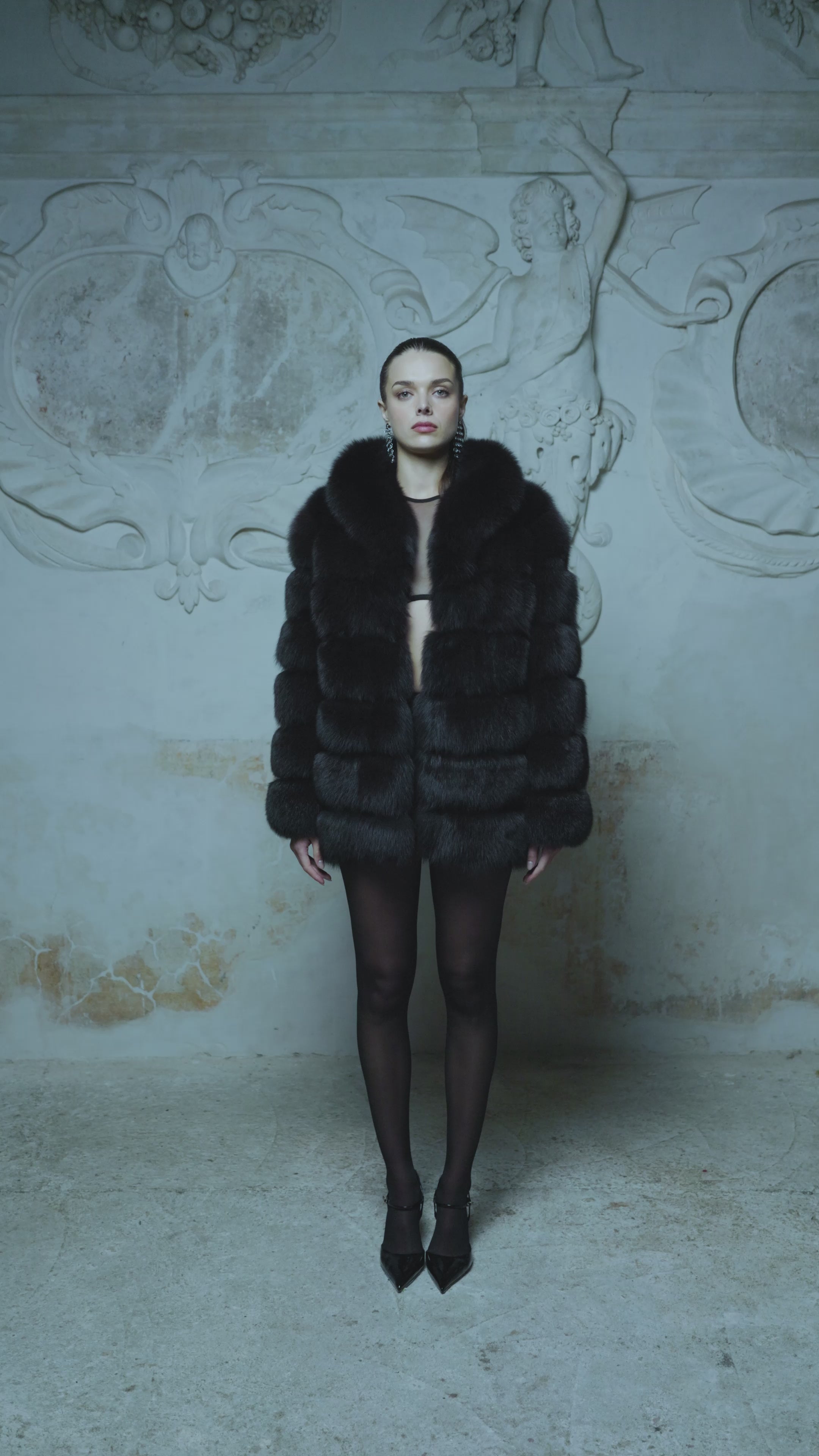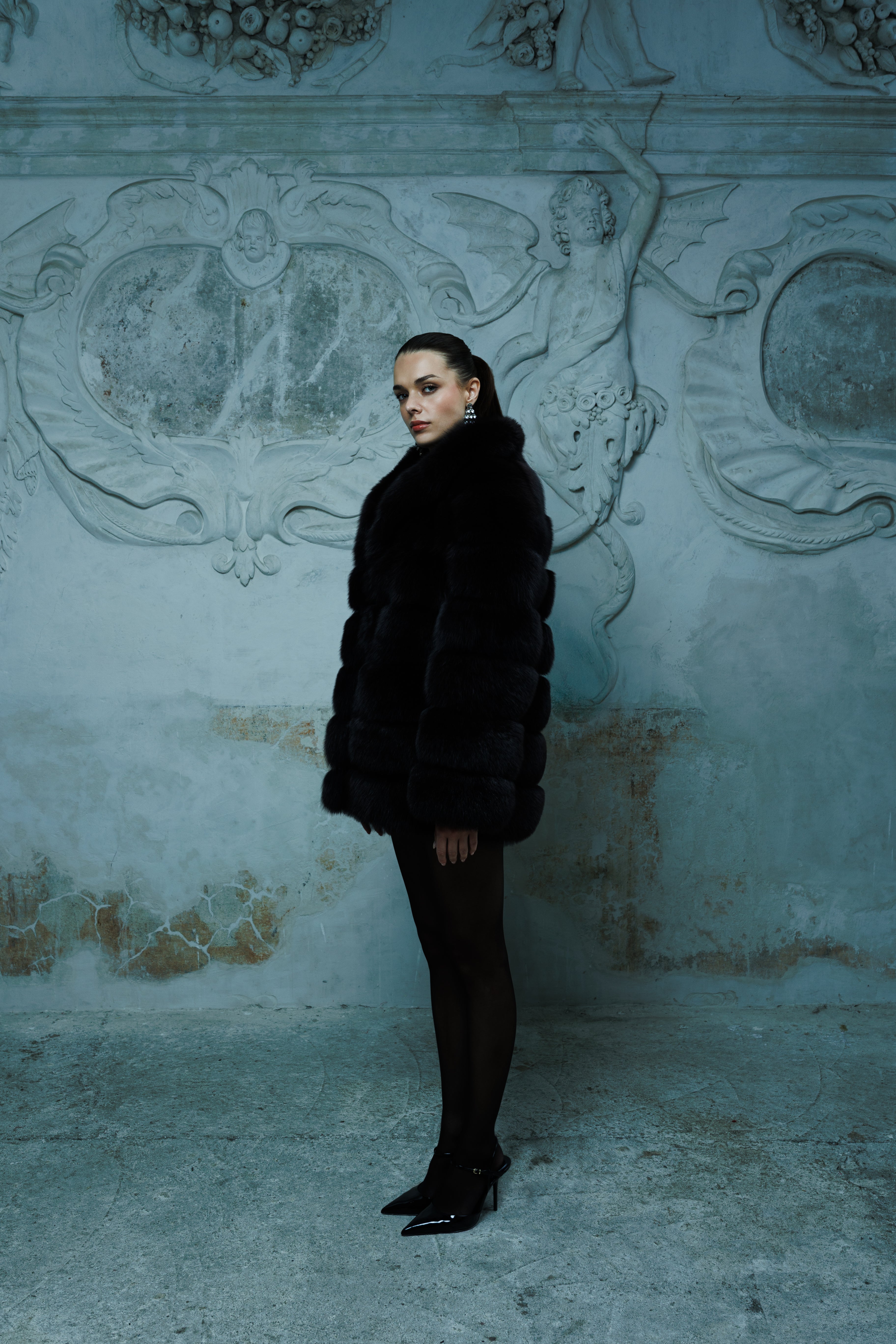 Futro wykonane z naturalnego lisa w głębokim, czarnym odcieniu, zaprojektowane w formie poziomych segmentów, które nadają sylwetce architektoniczną lekkość i rytm.