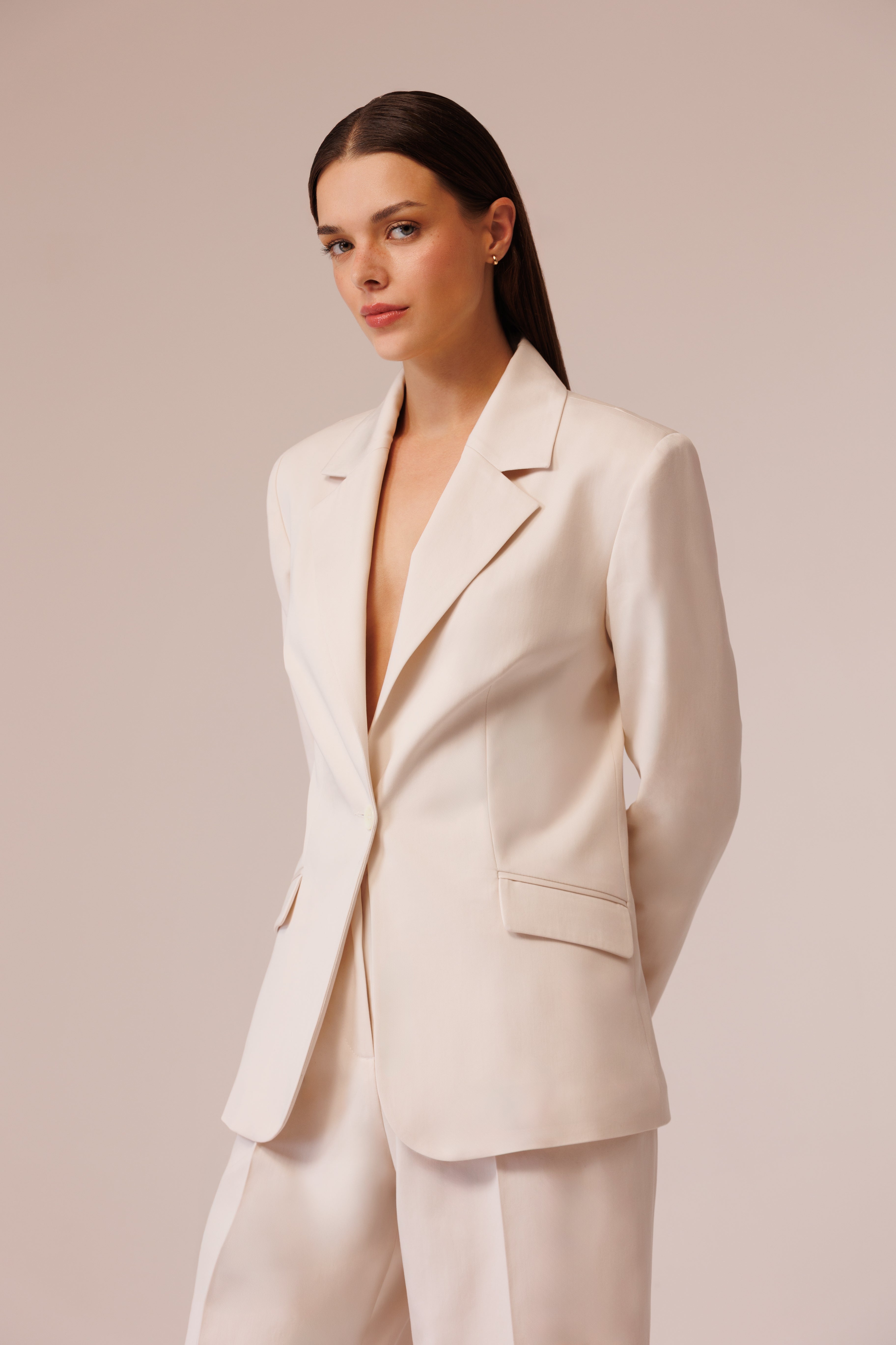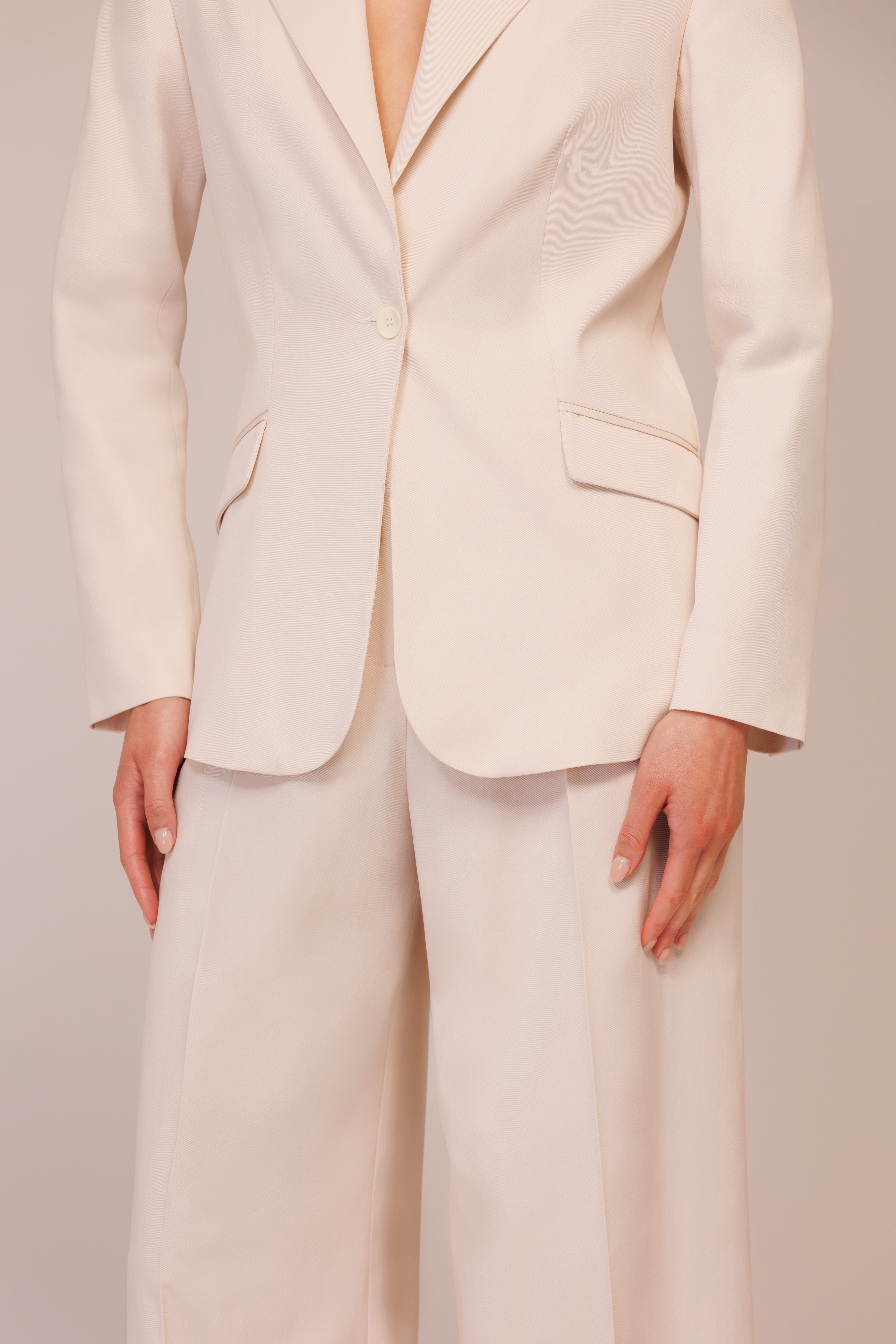 Kostymsetet, som består av en exakt utformad kavaj och vida byxor, har skapats av en högkvalitativ blandning av Tencel-fibrer™ och bomull, vars struktur kombinerar en förfinad känsla, naturlig andningsförmåga och full bärkomfort, samtidigt som strukturerna får den formdisciplin som krävs. Kavajen, med sin mjuka midja, som är utformad med känsla för proportioner och strävan efter en klar form, avslutas med en massiv knapp i naturpärla med djup färg och ädel volym, som inte stör balansen i designen utan kompletterar den, tillsammans med fyra identiska knappar vid manschetterna och två påsydda fickor symmetriskt placerade på framsidan, så att helheten uppnår en arkitektonisk balans. Kavajens insida är förfinad med ett foder i en ton som harmonierar med tygets grundfärg, skuret för att subtilt följa silhuettens anatomiska linje utan behov av någon förstyvning, vilket helt förmedlar kvaliteten och logiken i skrädderiet.