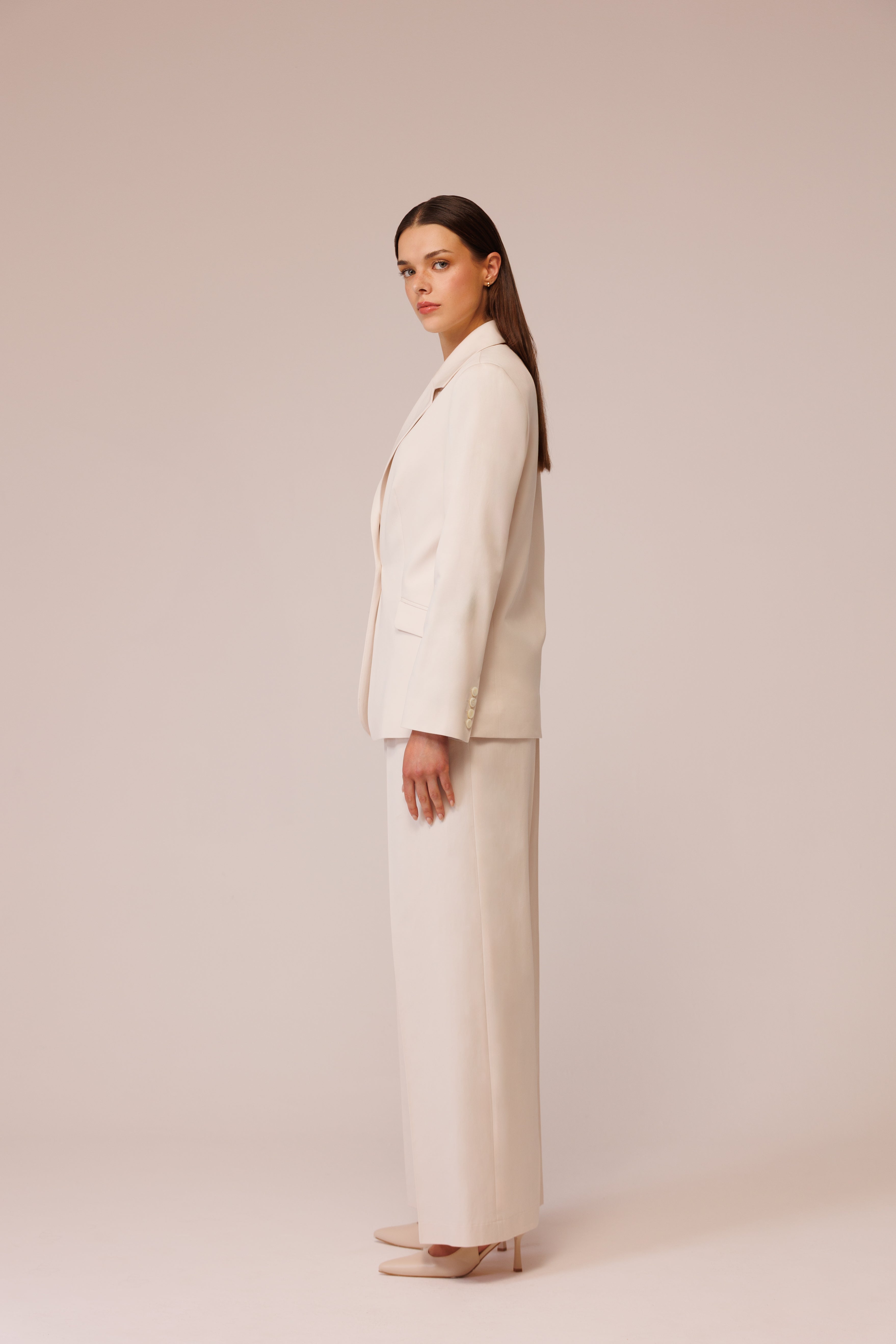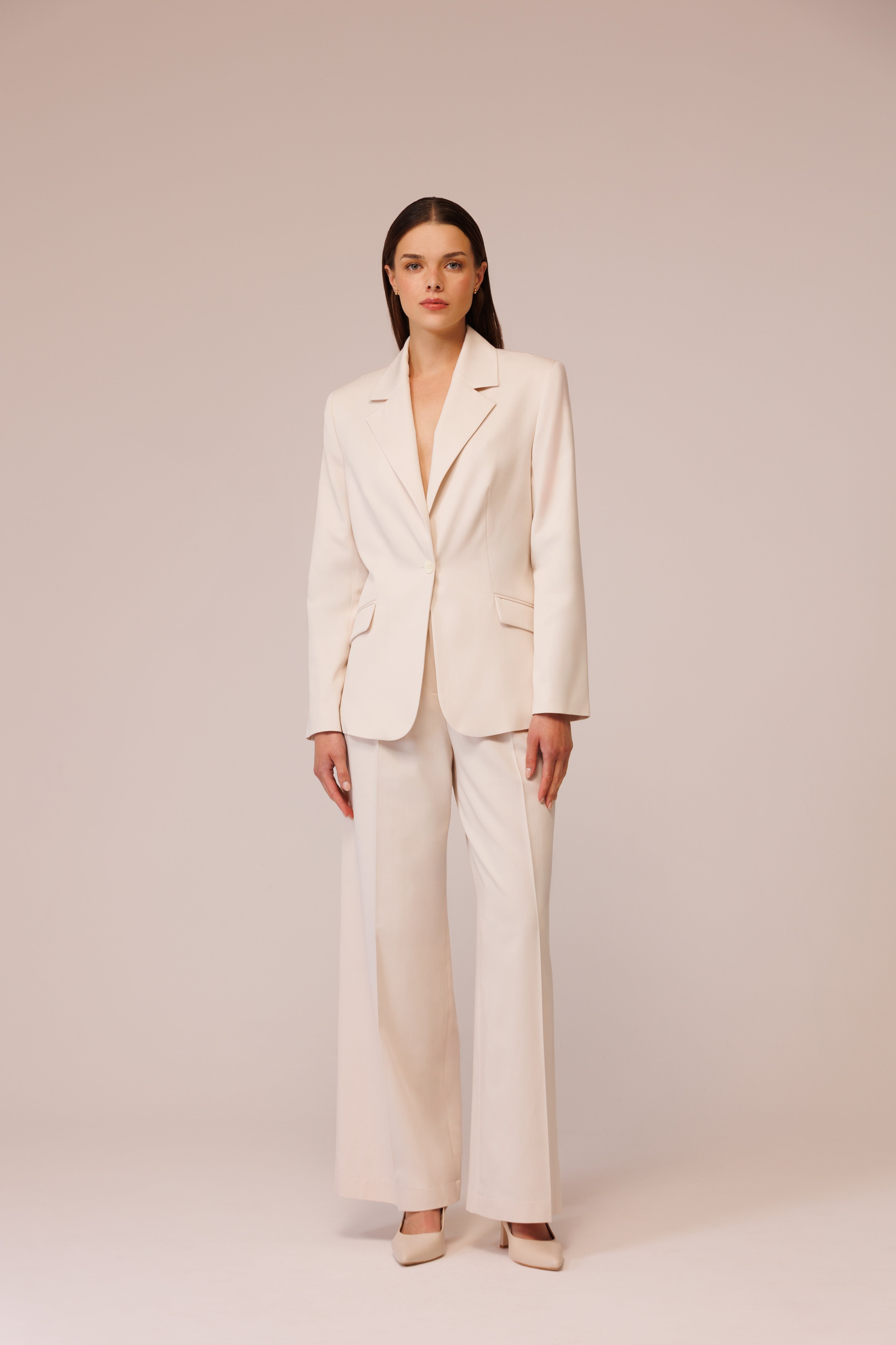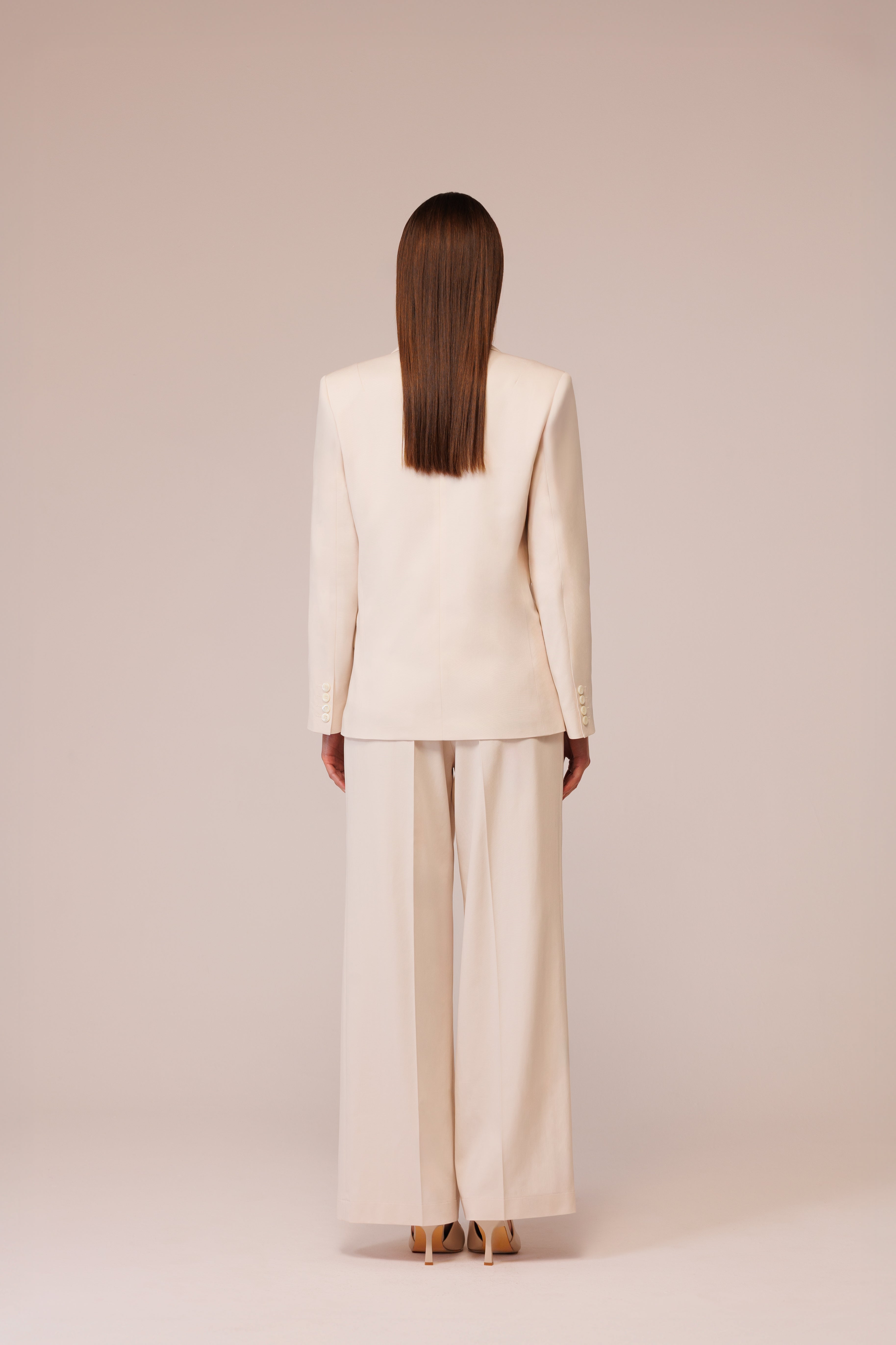 De långa, raka och vida byxorna har utvecklats som en fortsättning på samma designtanke, med rytm, balans och elegans i förgrunden. Exakt quiltade överlappningar på båda sidor framtill ordnar designen från midjan, skapar optisk lätthet och introducerar arkitektonisk spänning mot den vertikala kantningen, som smidigt förlänger benen och förstärker sofistikeringen av hela silhuetten. Quiltning baktill och en upphöjd fåll förstärker kroppens kontur utan att överdriva den, medan en massiv knapp i samma naturliga pärlemor som på kavajen är placerad i slutet av bältet som en detalj som avslutar designen inte bara praktiskt utan också estetiskt och för samman alla element i en konsekvent, suverän komposition.
